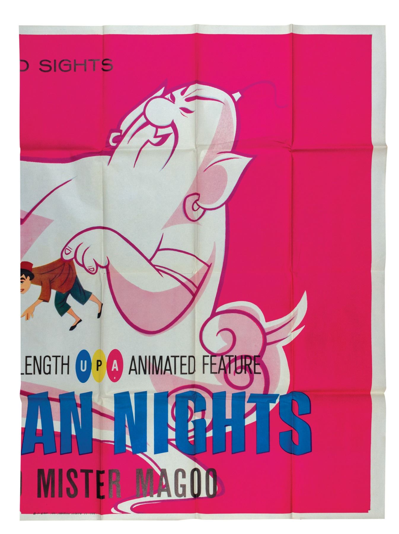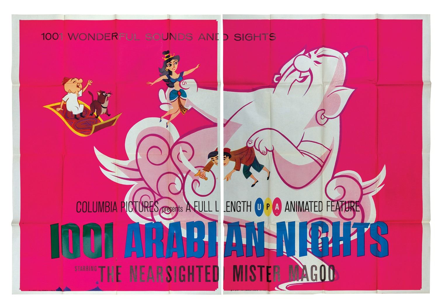 (UPA, 1959) A stunning lithographic poster for UPA's animated film 1001 Arabian Nights starring Mr. Magoo. The film was loosely based on the story of "Aladdin" from One Thousand and One Nights, and elements such as the genie, Aladdin, and a magic carpet can all be seen in the poster. The film is also notable as the first animated feature to be released by Columbia Pictures. The poster is composed of two 54"x40" sheets that measure 54"x80" when assembled. The poster is in good overall condition with some wear to the original fold lines and along the edges.