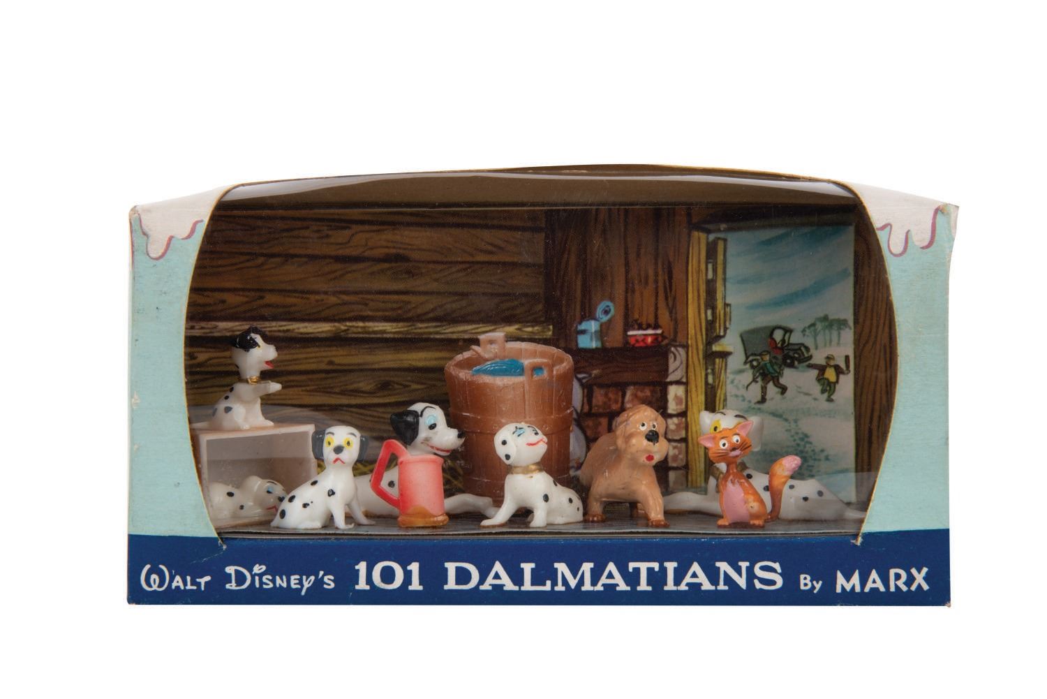 (Disney/Marx, 1961) "The Journey Home" scene playset by Marx Disneykins, from One Hundred and One Dalmatians. Six sets were produced by Marx for this animated feature, this one includes figures on Pongo, Perdita, the Colonel, Sergeant Tibbs, and four puppies. The scene and figures ranging from .5" to 1.5" high are in very fine condition, inside a 3.5'x1.5'x6.5" box in very good condition, showing slight wear from age, and bowing at the top.