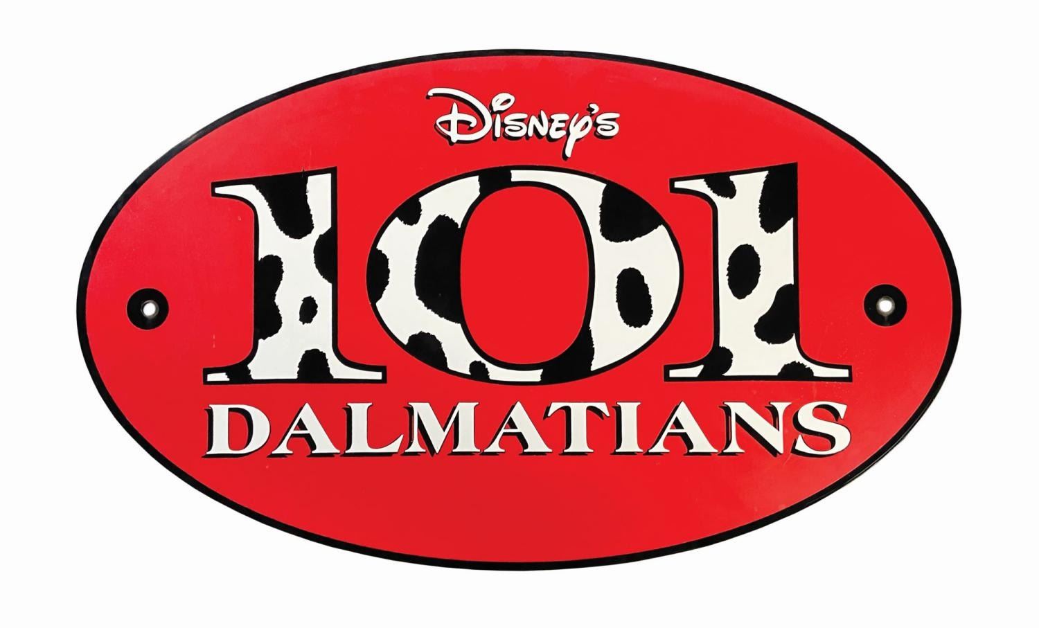 (Disney-MGM, 2002) A park-used sign for the 101 Dalmatians incarnation of the Backstage Pass attraction at Disney Hollywood Studios. Consisting of an acrylic sign with applied vinyl decals reading, "Disney's 101 Dalmatians," the sign is equipped with holes at both sides for mounting and measures 19"x33". It is in very good condition with a few minor splits to the decals, surface bubbling to the background, scratches, scrapes, and weathering.