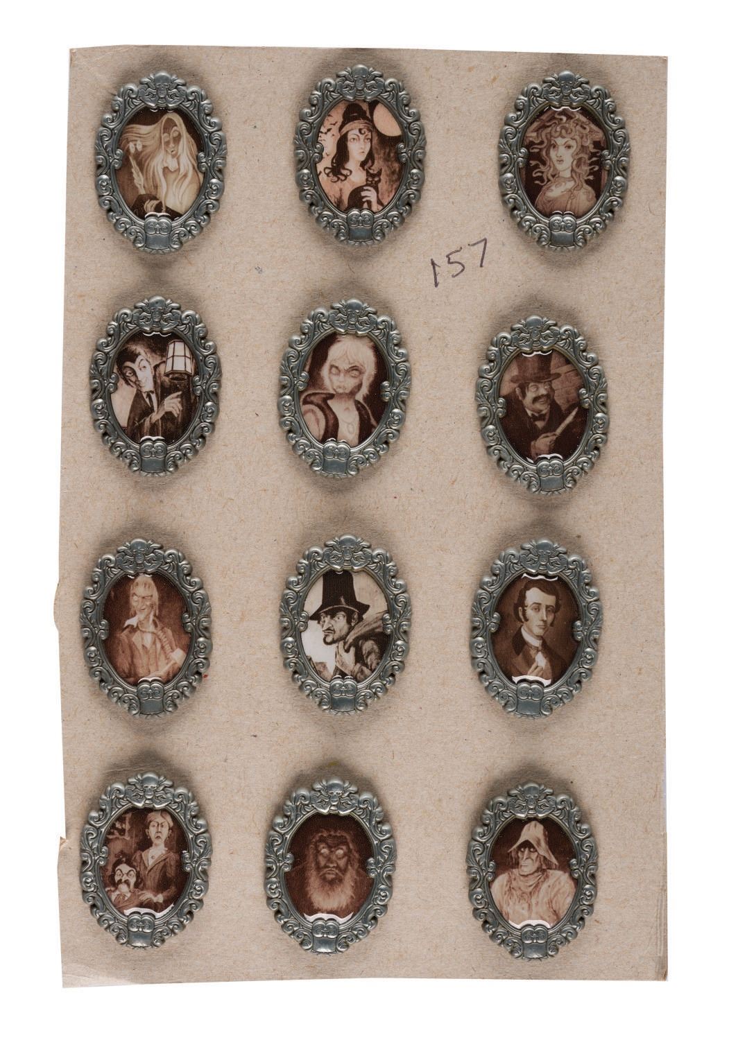 (Walt Disney World, 2017) A collection of (12) pins inspired by Marc Davis' designs of the "Happy Haunts" that inhabit the changing portraits and Library of The Haunted Mansion at Walt Disney World. Among the lot are Medusa, the Ghost Host, and other rarely seen ghosts within a metallic cameo, each once offered exclusively during an event at Walt Disney World. Measuring 1.5"x1", each pin is in fine overall condition.