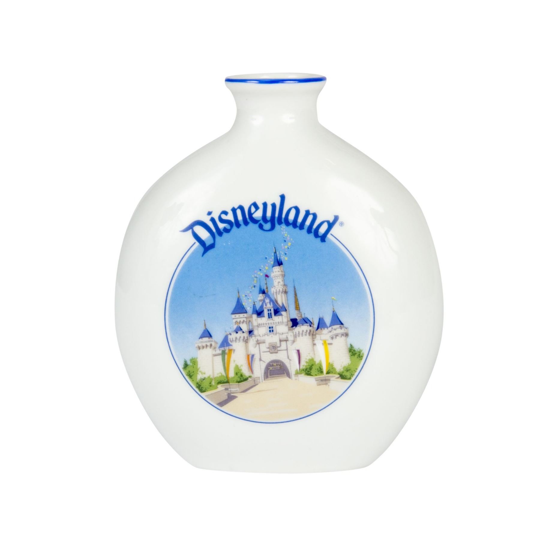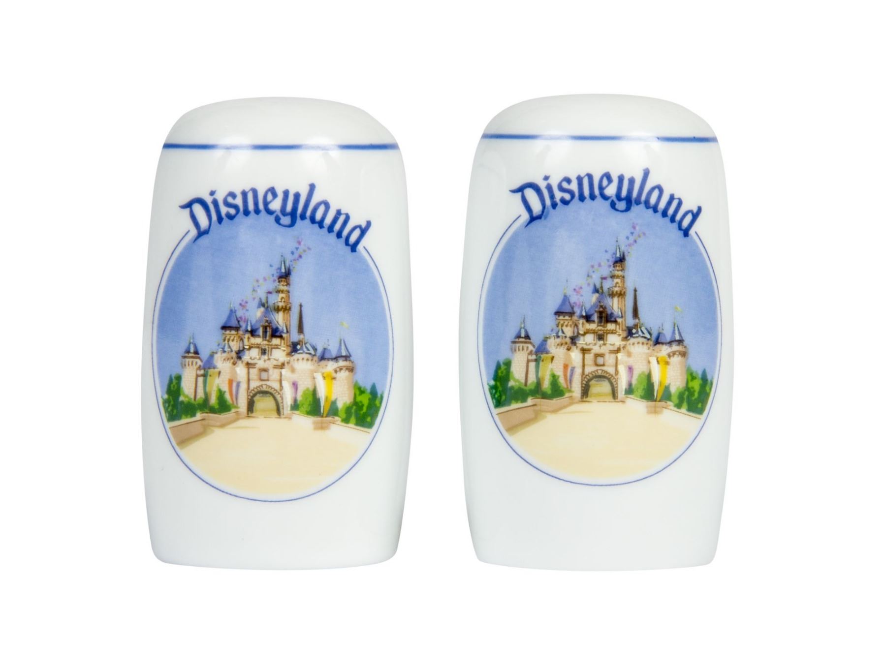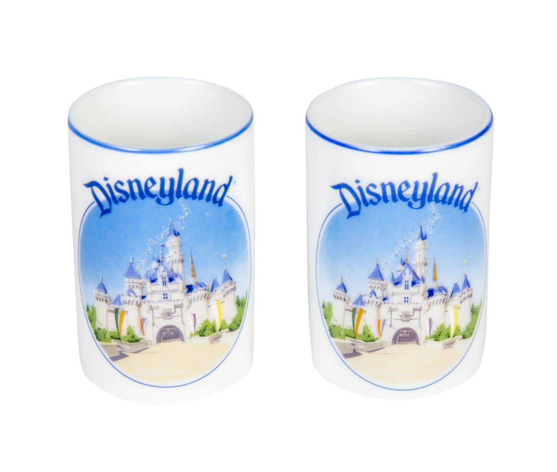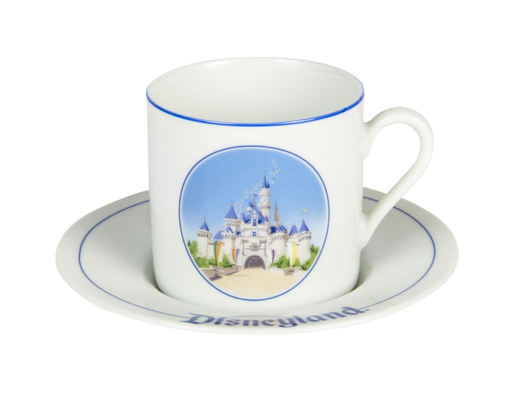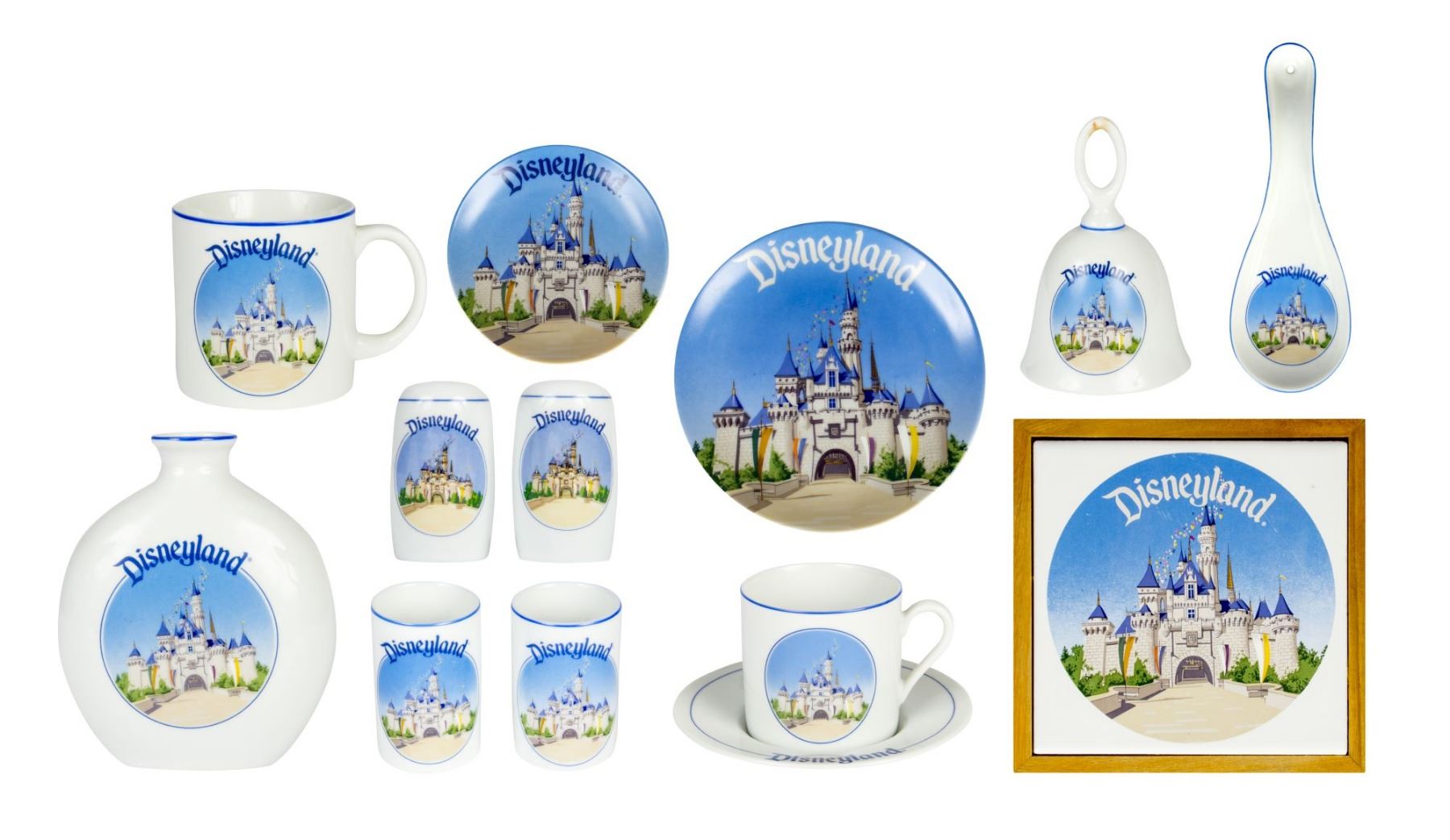 (Disneyland, c.1980s) A beautiful 14-piece ceramic set featuring matching Sleeping Beauty Castle imagery. The set includes a trivet, small plate, medium plate, salt & pepper shakers, two coffee cups, two small creamer cups, spoon rest, cup and saucer, bell, and bud vase. The ceramic set is in overall very good condition with some spots of scattered wear from light use.