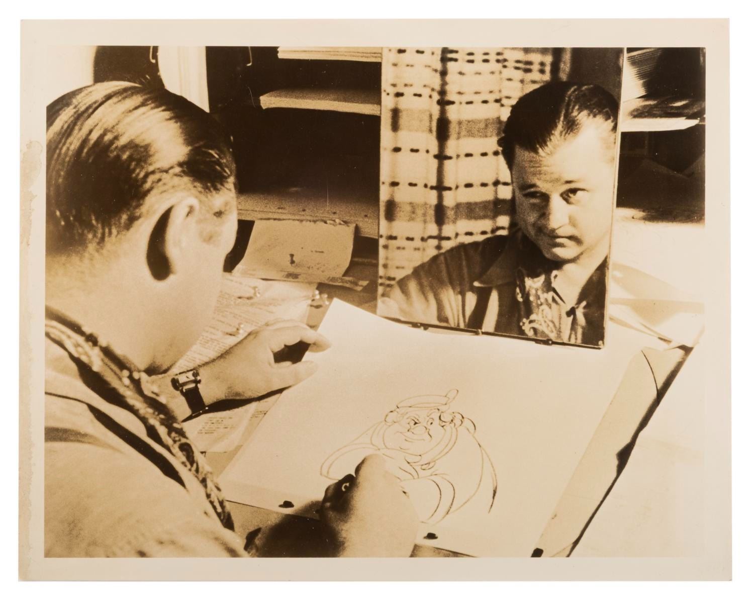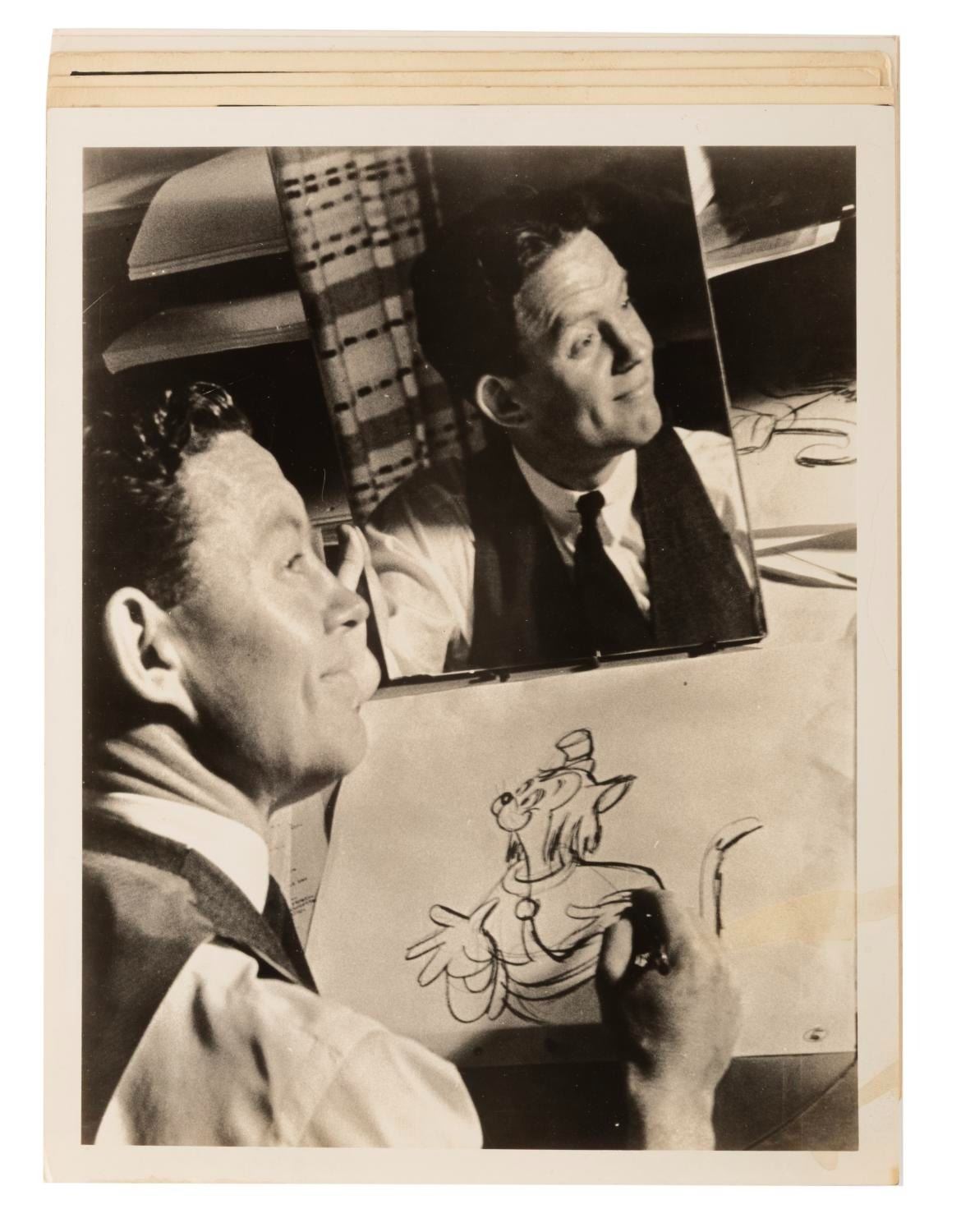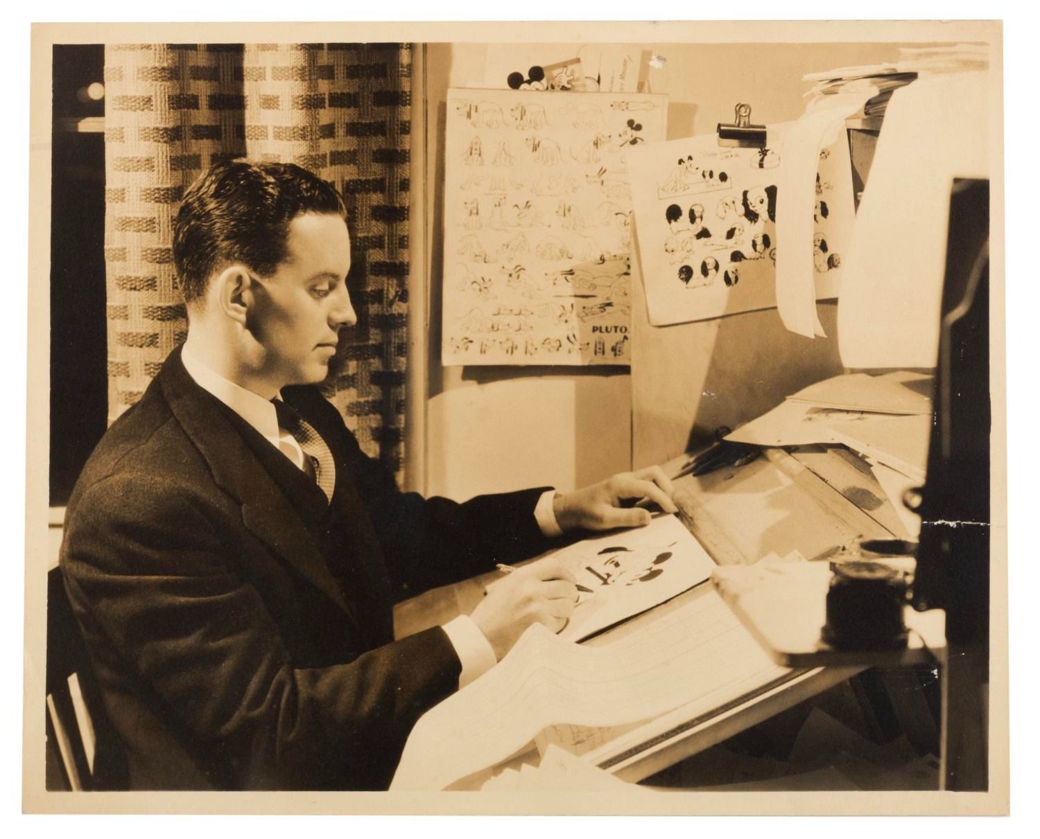 (Disney, 1930s) A collection of seven photos printed in the 1930s of Disney artists at work at the Hyperion Studio. Four photos show artist Norm Ferguson drawing Mickey, Pluto, Gideon from "Pinocchio," and reviewing film footage. One print shows Charles Nichols drawing Pinocchio’s Coachman, and the last two prints are identical images of Fred Moore drawing Jiminy Cricket. Three of the Ferguson prints are stamped on the back "Clarence Sinclair Bull Photo - Kindly Credit" - identifying these as very clear prints made from the original negatives of these historic images. Each measuring 8" x 10", the prints are in very good condition with toning from age and light handling and wear, including a 1" scratch to the edge of one Ferguson print.
