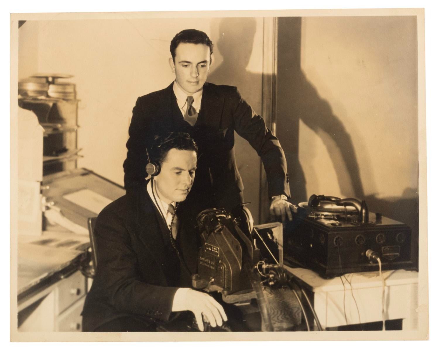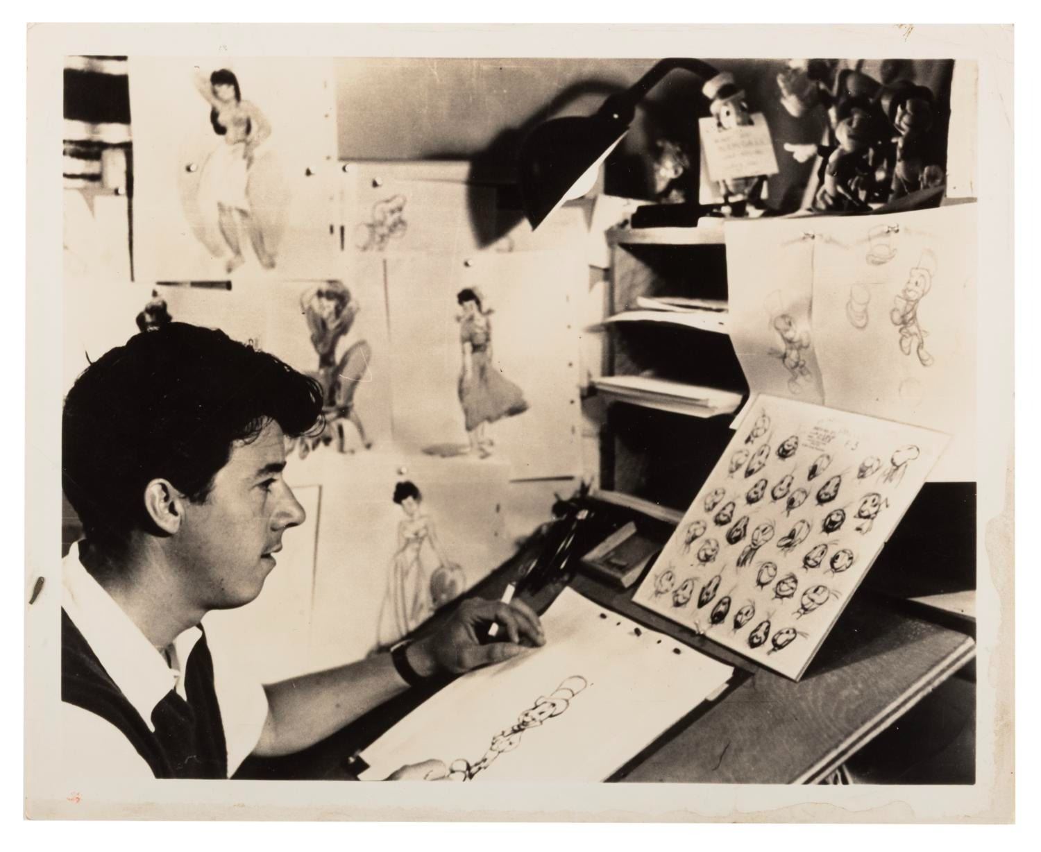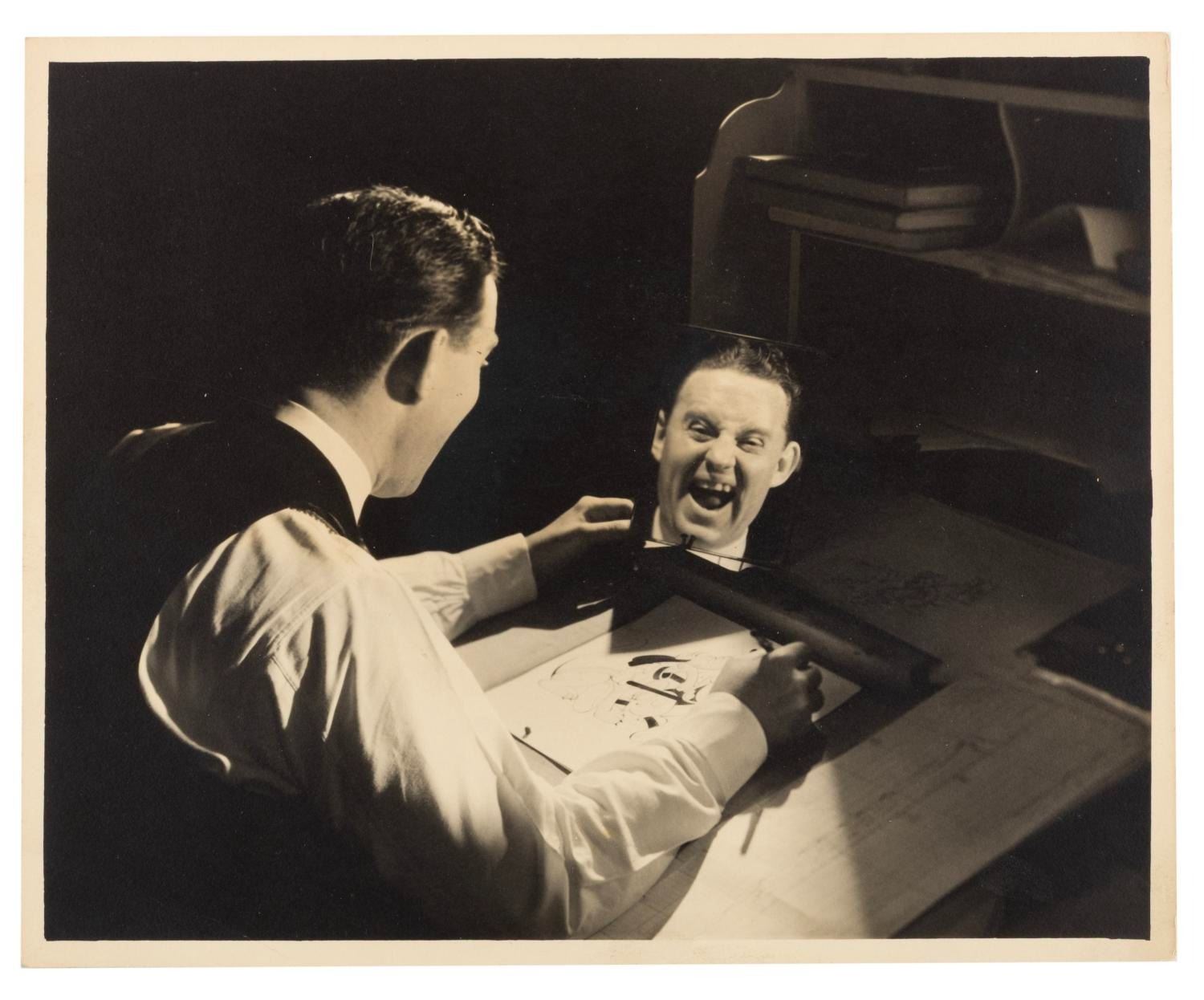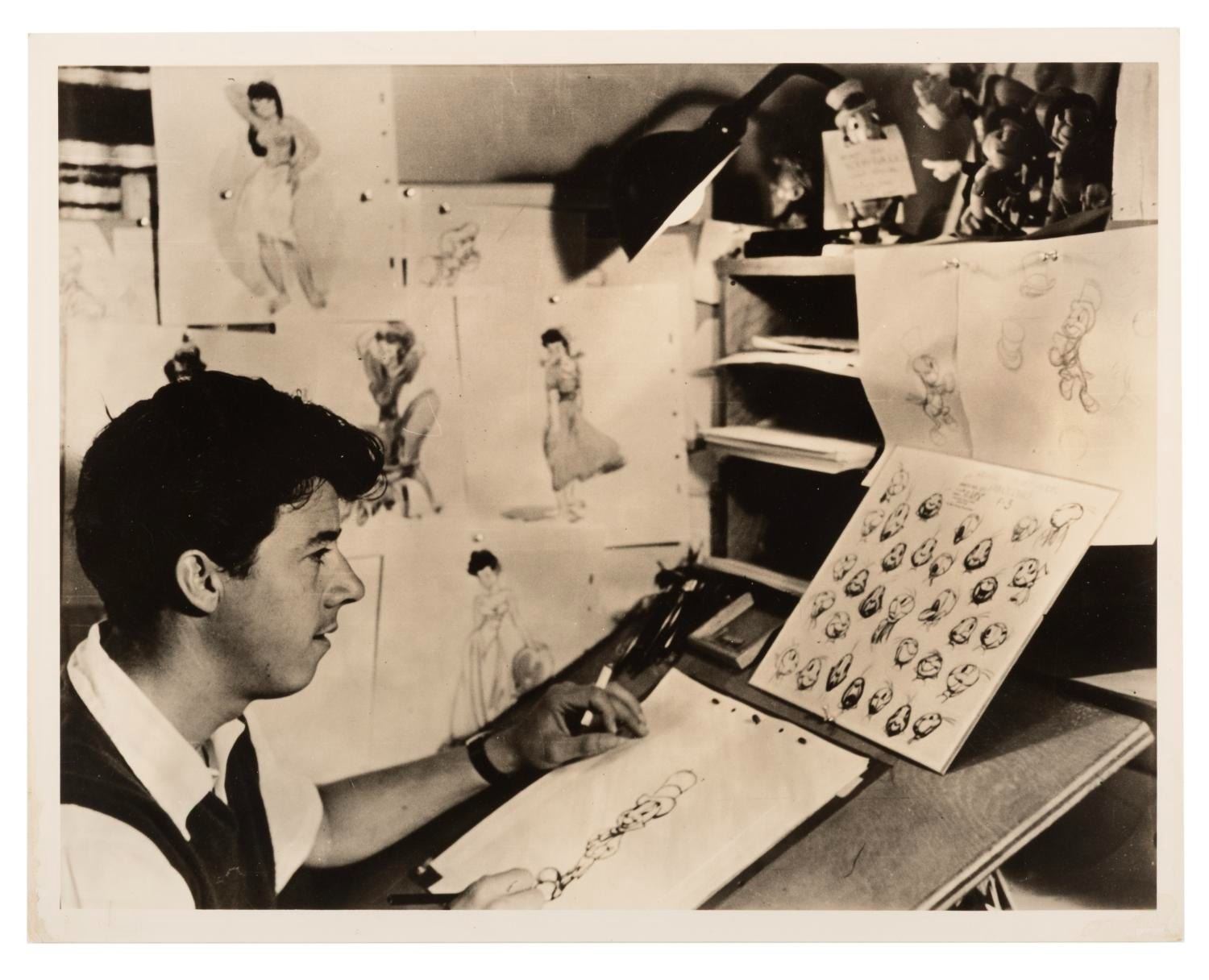(Disney, 1930s) A collection of seven photos printed in the 1930s of Disney artists at work at the Hyperion Studio. Four photos show artist Norm Ferguson drawing Mickey, Pluto, Gideon from "Pinocchio," and reviewing film footage. One print shows Charles Nichols drawing Pinocchio’s Coachman, and the last two prints are identical images of Fred Moore drawing Jiminy Cricket. Three of the Ferguson prints are stamped on the back "Clarence Sinclair Bull Photo - Kindly Credit" - identifying these as very clear prints made from the original negatives of these historic images. Each measuring 8" x 10", the prints are in very good condition with toning from age and light handling and wear, including a 1" scratch to the edge of one Ferguson print.