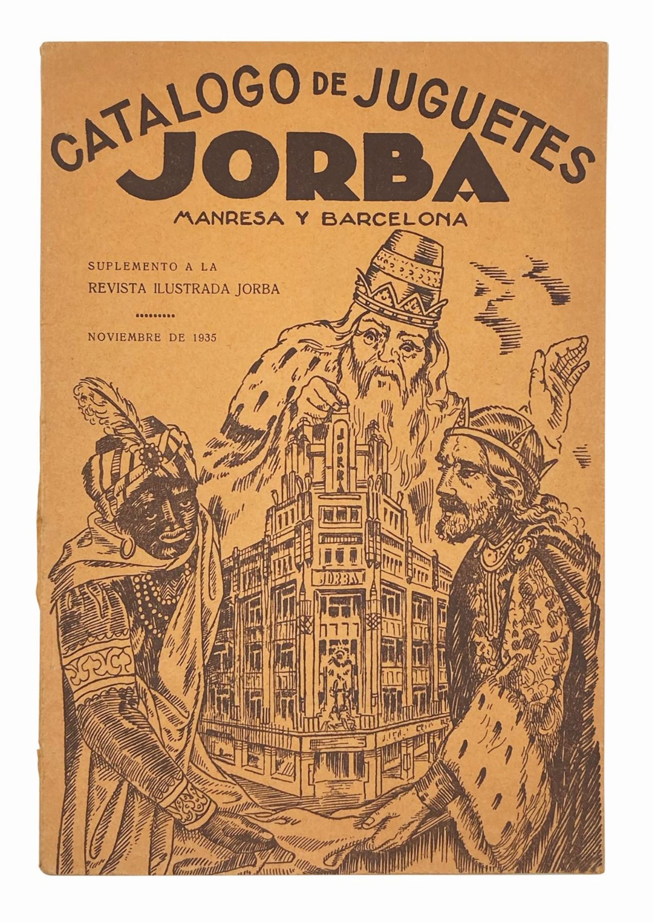 (Disney, 1935) A vintage catalog for the Spanish department store Jorba featuring many rare Disney toys. The 56-page printed catalog contains rare appearances of scarcely-seen early Disney merchandise, such as Spanish versions of Marx classics, pull toys of Mickey, figures of Mickey and Pigs, Mickey target sets, and much more, among other non-Disney offerings. This is the only such catalog known to feature these Disney toys from this era, and perhaps the last great compendium of Spanish toys of the 1930s. Measuring 11”x7.5”, the catalog is in very good condition with some edge browning and minor splitting to the spine from wear. There is a stamp and signature on the interior title page that is attributed to its original use.