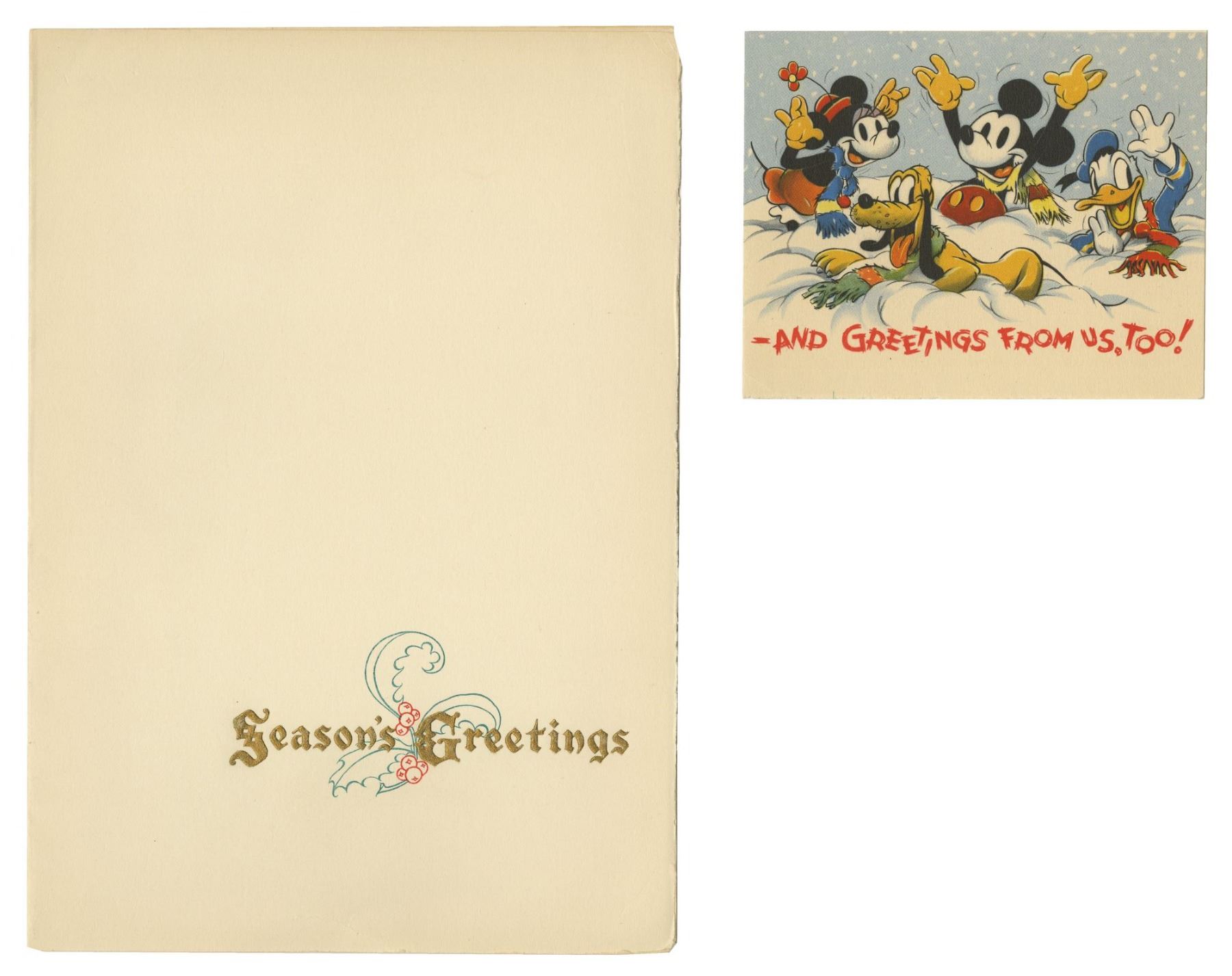 (Walt Disney Studios, 1937) A very rare Christmas card from Walt Disney Productions. This Christmas card includes one large tipped-in Snow White and the Seven Dwarfs print, as well as a second smaller print with Mickey, Minnie, Donald, and Pluto that reads "and greetings from us, too!" Measuring 10"x7", the card is in very good condition with minor wear, including some yellowing inside the card from the adhesive used to hold the print in place.
