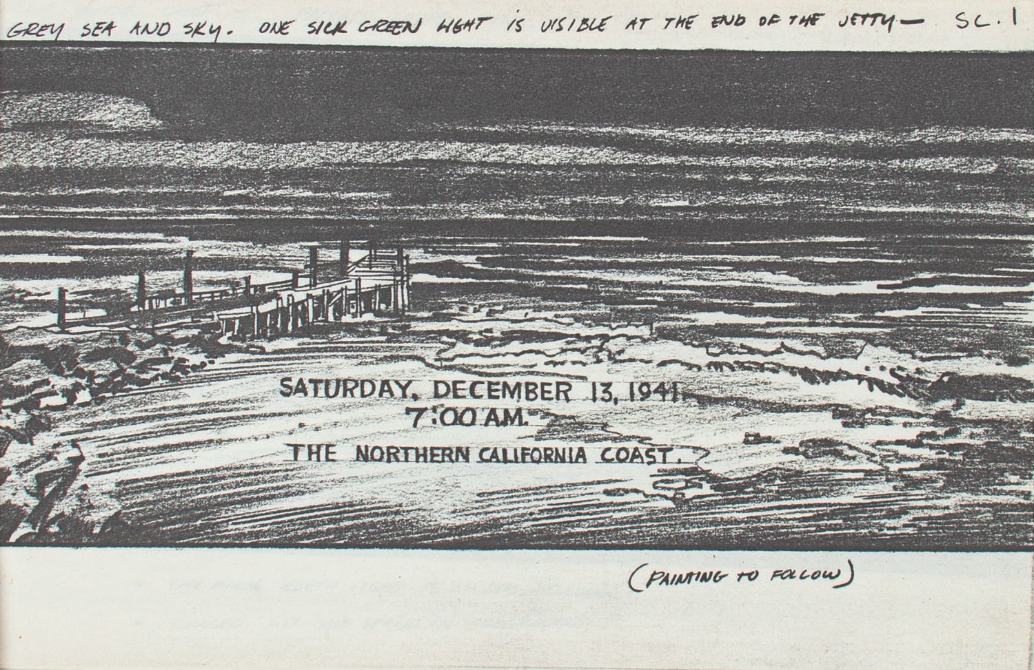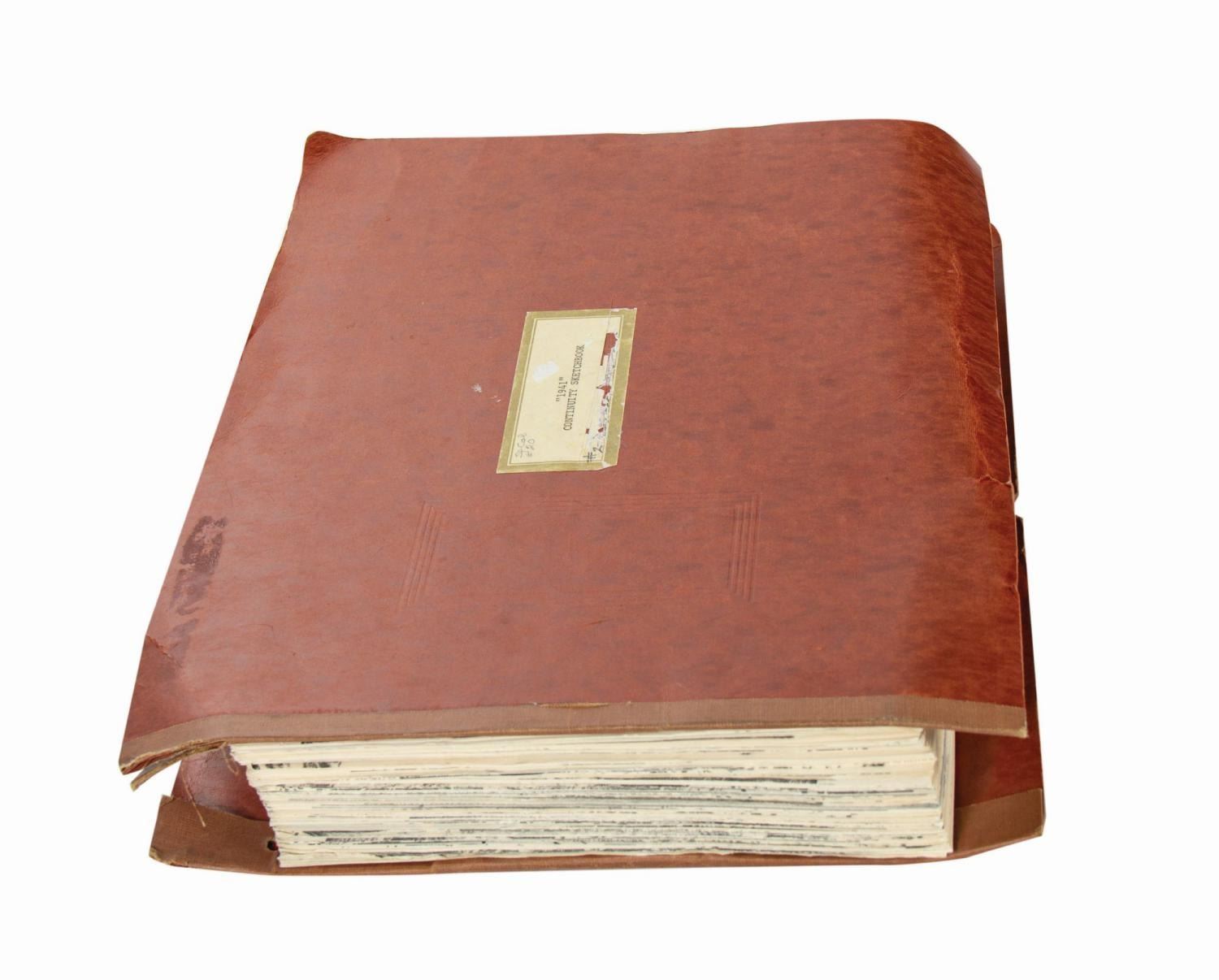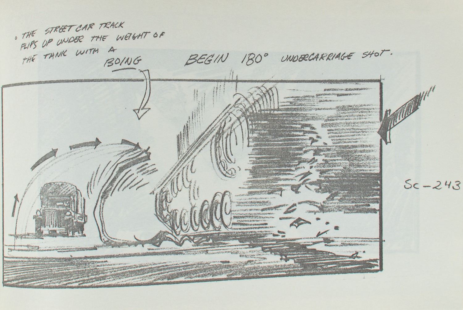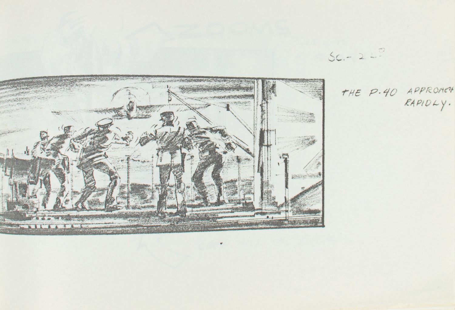 (Universal, 1979) A complete set of copy storyboards bar bound in pressboard covers from the Steven Spielberg WWII comedy, 1941. The contents consist of (380+) xeroxed pages of hand drawn storyboards depicting the intended composition of virtually every shot in the film with handwritten captions describing the action to take place therein. This comprehensive continuity sketchbook would have been a vital resource for Spielberg, cinematographer Bill Fraker, and other departments during production of the film. Measuring 8.5"x14", the storyboards are in very good condition with some edge and corner creasing and wear from use. The covers exhibit tearing, creases, stress lines, and handling.