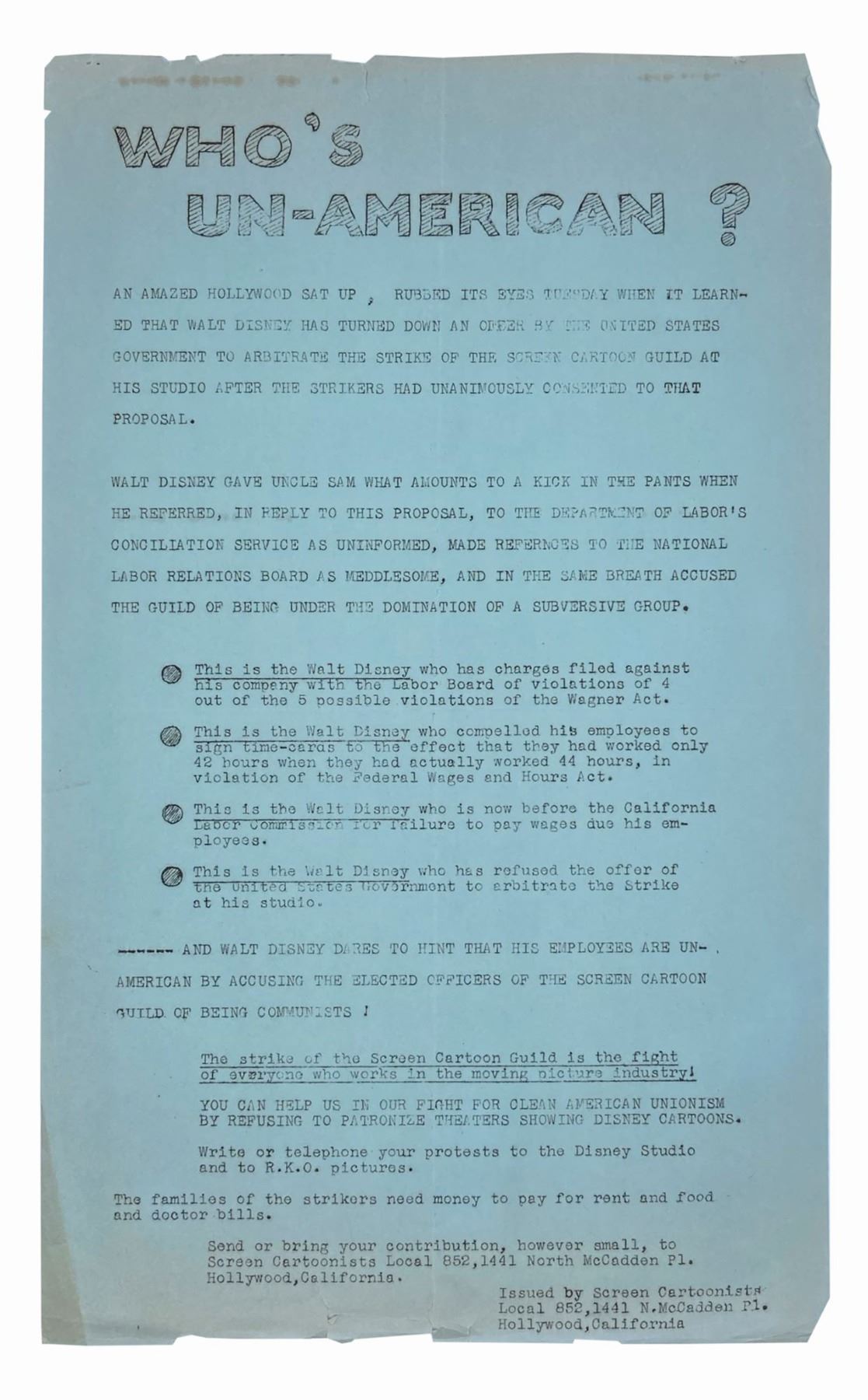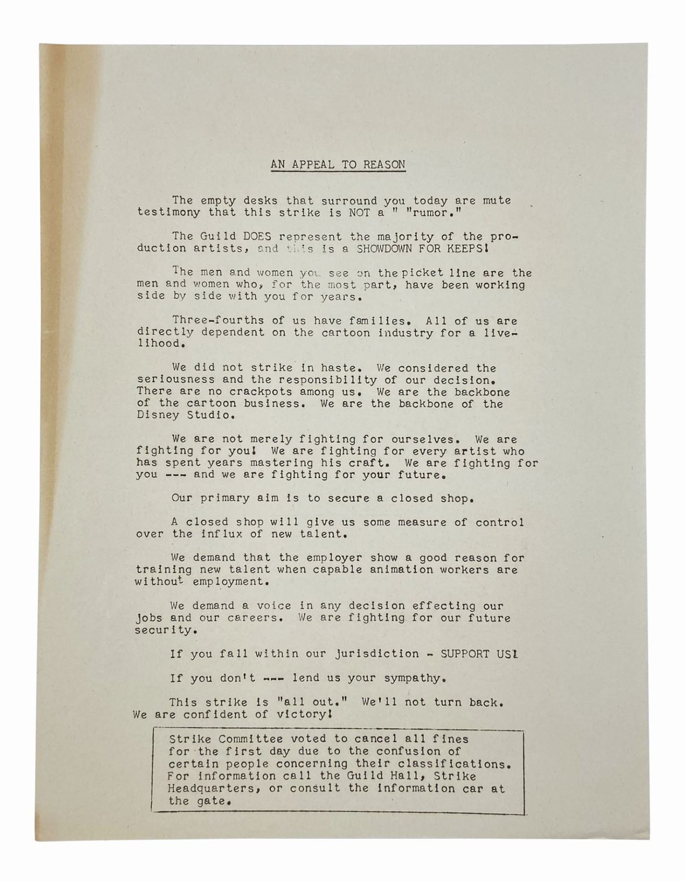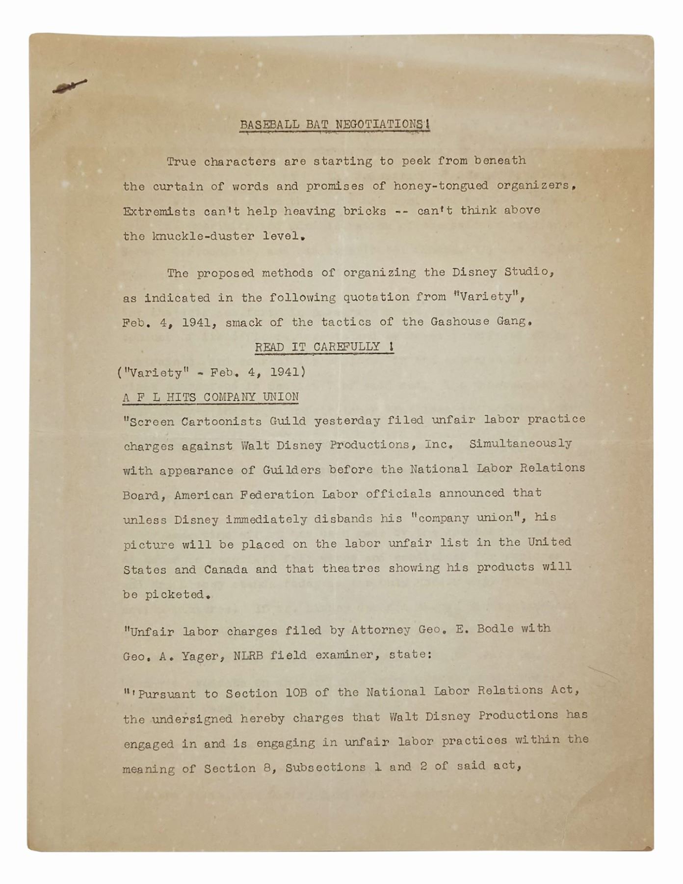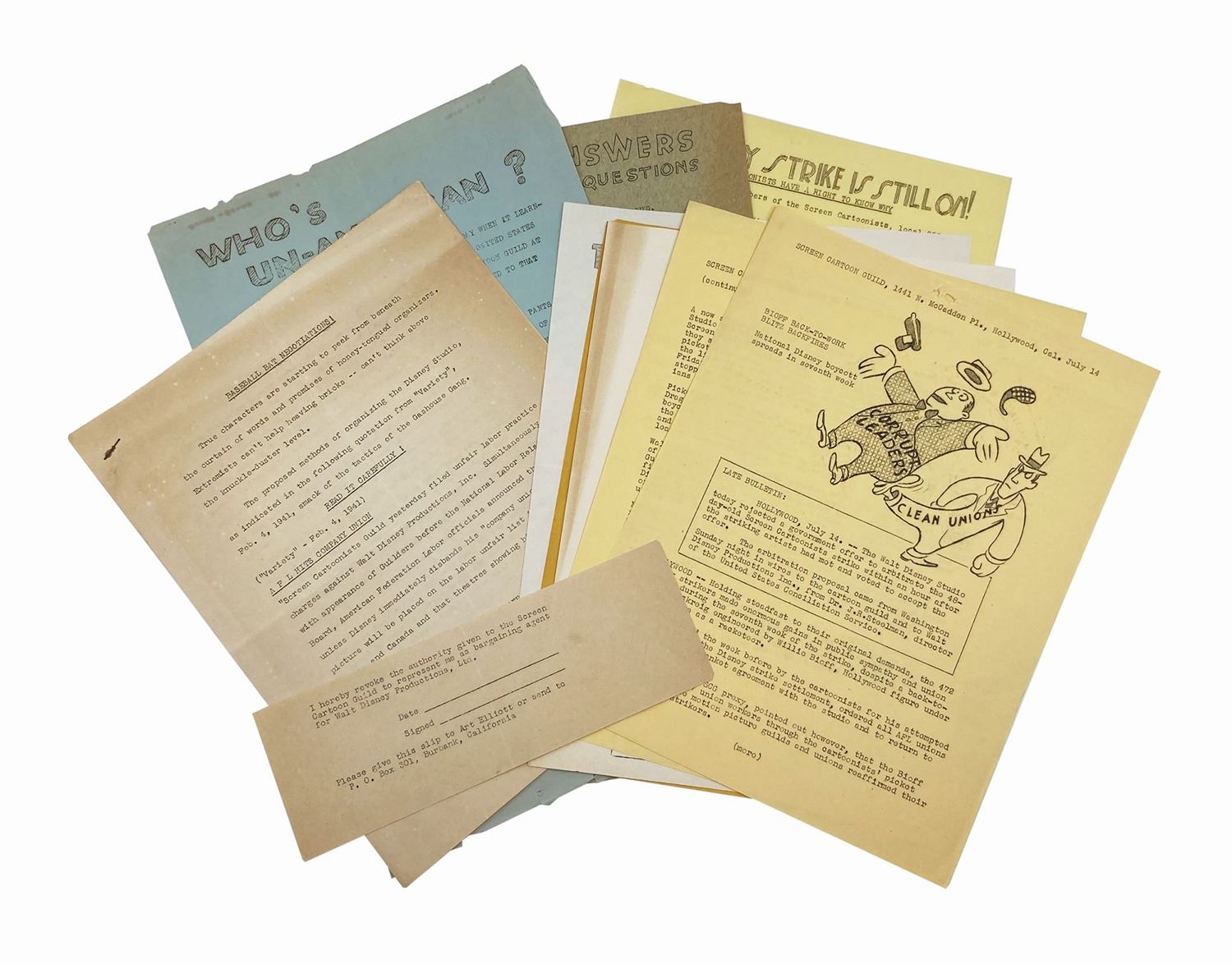 (Disney, 1941) An incredibly rare archive of documents that were created and distributed during the historic Disney animator's strike of 1941. Following the Great Depression of the 1930s, there was a rise of union organization in Hollywood which included the creation of the Screen Cartoonist's Guild (SCG) in 1938. Many Walt Disney Studios employees were discontent with their pay and working conditions, citing an unclear pay structure between similar jobs and noticing preferential treatment and studio perks being only given to certain head animators and writers. Walt Disney's opinion, however, was that his studio's employees were some of the best paid in the industry, and with the move to the new Burbank studio in 1940, they enjoyed some of the best working conditions. As such, Disney refused on multiple occasions to come to terms with the SCG, feeling that it was his company to do with as he pleased. The disagreement came to a head when Disney fired several of his employees who were members of the guild. The following day, on May 29, 1941, over 200 employees of the Walt Disney Studios went on strike. The strike notably interrupted the production of Dumbo, which released in October of that same year, and Disney had some of his striking animators portrayed as circus clowns within the film as a small jab. With tensions rising, Walt left the studio for a goodwill tour of Latin America as part of the U.S. "Good Neighbor policy" during the early stages of production on the films Saludos Amigos and The Three Caballeros. Walt's absence helped tensions cool, and upon his return, he signed a union contract with the National Labor Relations Board. This archive includes (10) documents created and distributed during this historic strike. Many of the documents are written from the perspective of the strikers, and were used to inform both the studio's non-striking artists and the general public of the reasoning behind the strike, and also to paint Walt as the bad guy in the negotiations process. The documents are from various stages of the strike, with some mentioning Disney's outright refusal to let the United States government step in to help arbitrate the strike. The documents range in size from 3.5"x8.5" to 13.75"x8.5". The condition is good overall, with several fold-lines, small tears or wear around the edges, and scattered spots of discoloration from use. Original artifacts from this infamous part of Disney History are very scarce, with an archive of materials such as this being exceptionally rare.
