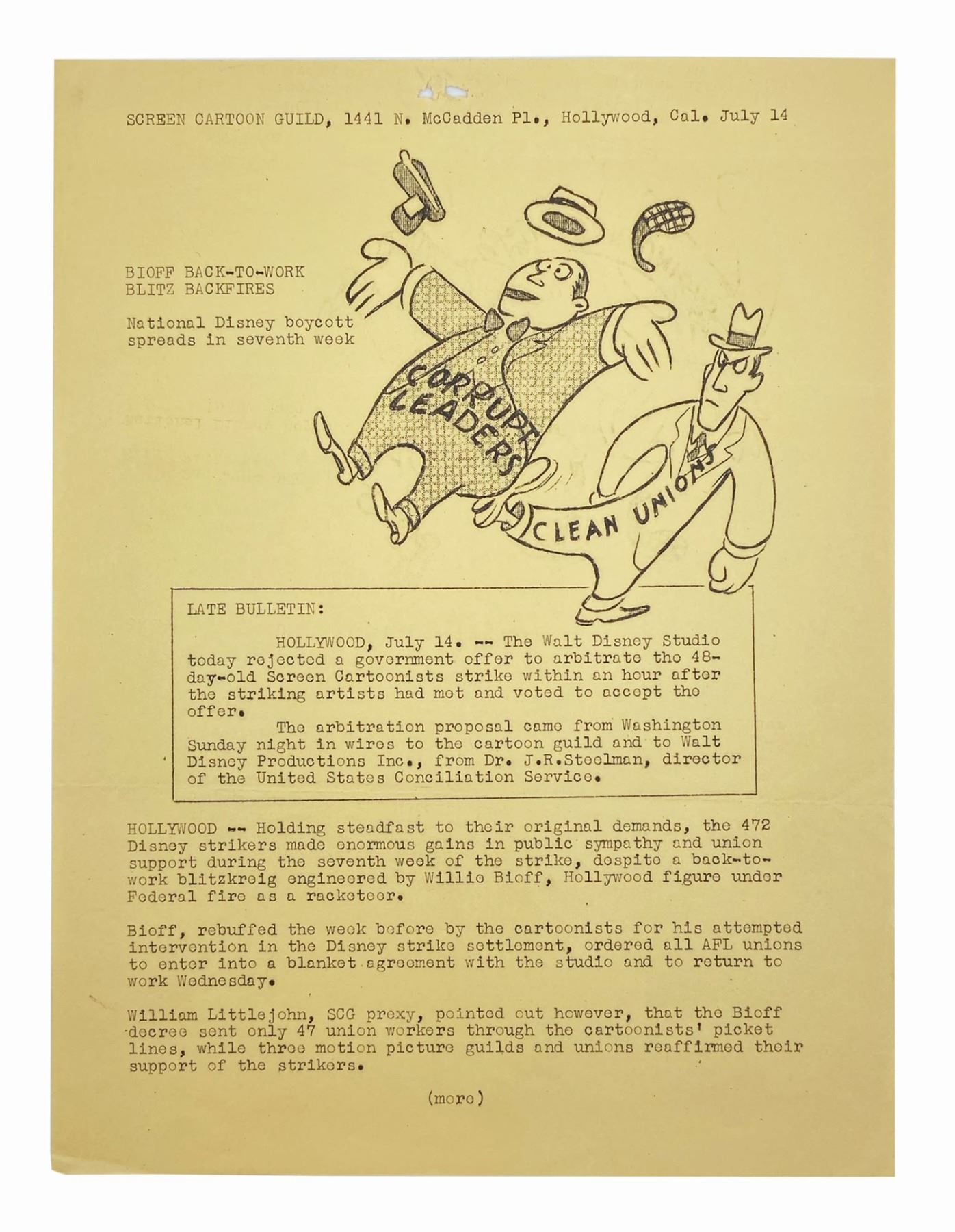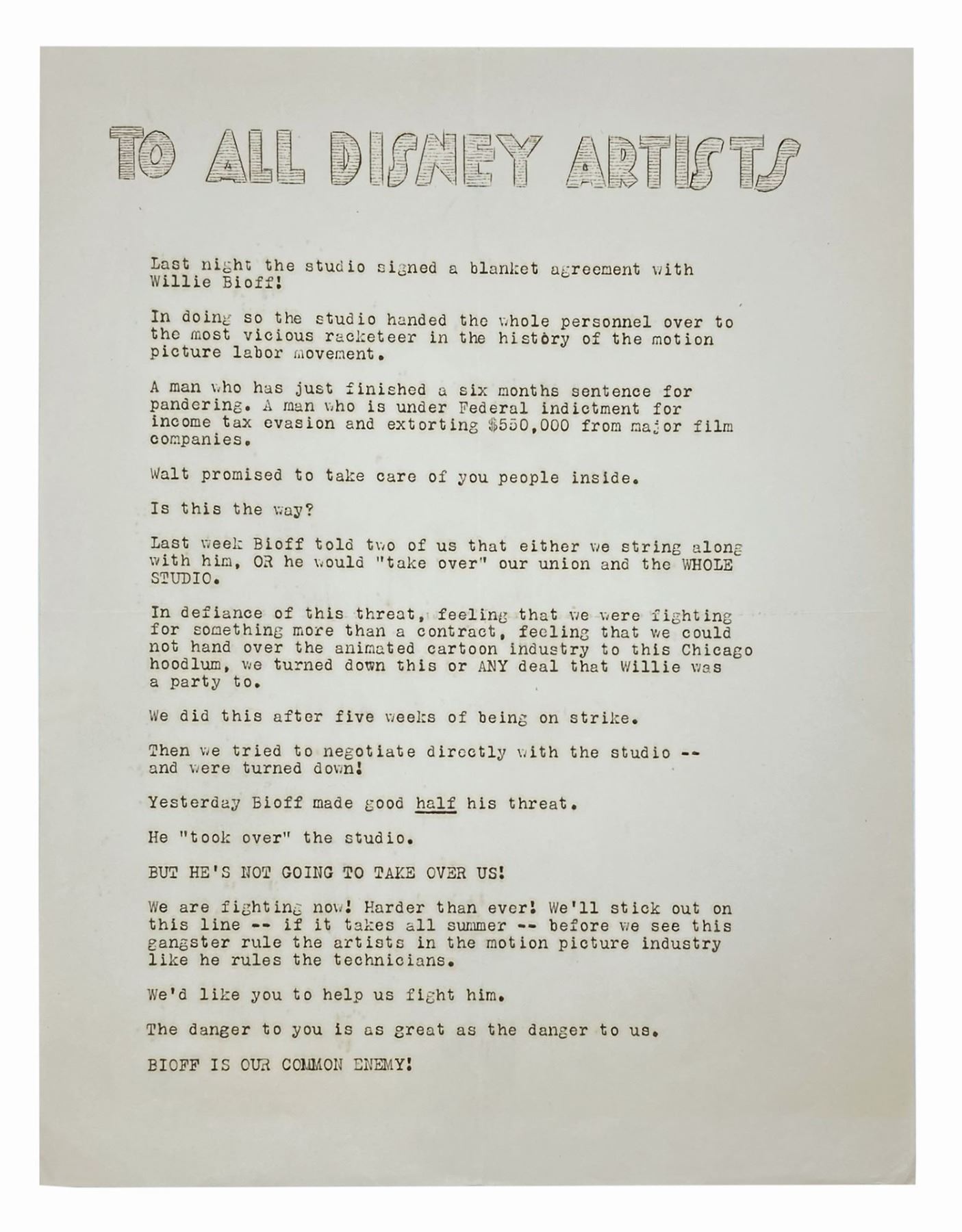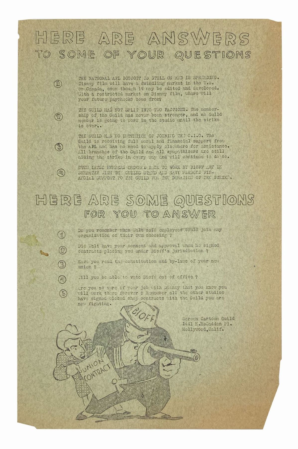 (Disney, 1941) An incredibly rare archive of documents that were created and distributed during the historic Disney animator's strike of 1941. Following the Great Depression of the 1930s, there was a rise of union organization in Hollywood which included the creation of the Screen Cartoonist's Guild (SCG) in 1938. Many Walt Disney Studios employees were discontent with their pay and working conditions, citing an unclear pay structure between similar jobs and noticing preferential treatment and studio perks being only given to certain head animators and writers. Walt Disney's opinion, however, was that his studio's employees were some of the best paid in the industry, and with the move to the new Burbank studio in 1940, they enjoyed some of the best working conditions. As such, Disney refused on multiple occasions to come to terms with the SCG, feeling that it was his company to do with as he pleased. The disagreement came to a head when Disney fired several of his employees who were members of the guild. The following day, on May 29, 1941, over 200 employees of the Walt Disney Studios went on strike. The strike notably interrupted the production of Dumbo, which released in October of that same year, and Disney had some of his striking animators portrayed as circus clowns within the film as a small jab. With tensions rising, Walt left the studio for a goodwill tour of Latin America as part of the U.S. "Good Neighbor policy" during the early stages of production on the films Saludos Amigos and The Three Caballeros. Walt's absence helped tensions cool, and upon his return, he signed a union contract with the National Labor Relations Board. This archive includes (10) documents created and distributed during this historic strike. Many of the documents are written from the perspective of the strikers, and were used to inform both the studio's non-striking artists and the general public of the reasoning behind the strike, and also to paint Walt as the bad guy in the negotiations process. The documents are from various stages of the strike, with some mentioning Disney's outright refusal to let the United States government step in to help arbitrate the strike. The documents range in size from 3.5"x8.5" to 13.75"x8.5". The condition is good overall, with several fold-lines, small tears or wear around the edges, and scattered spots of discoloration from use. Original artifacts from this infamous part of Disney History are very scarce, with an archive of materials such as this being exceptionally rare.