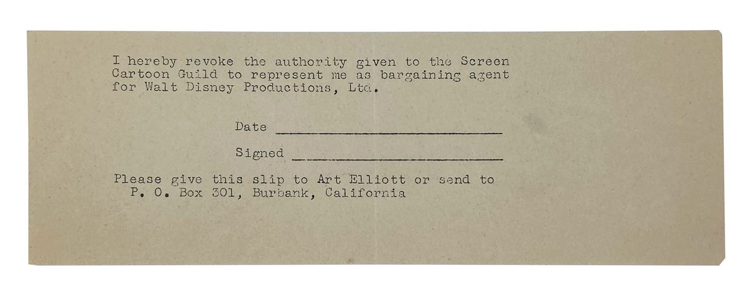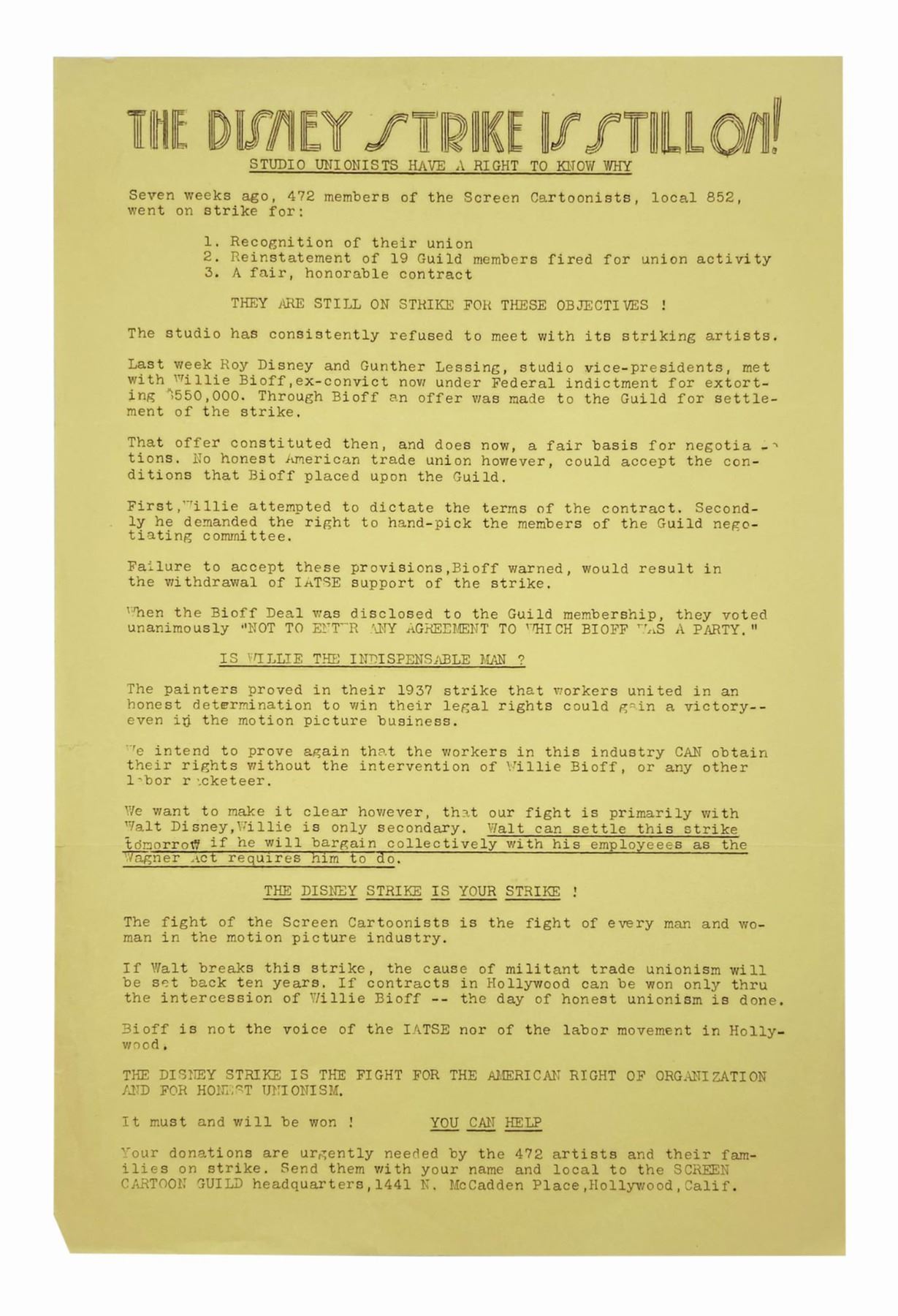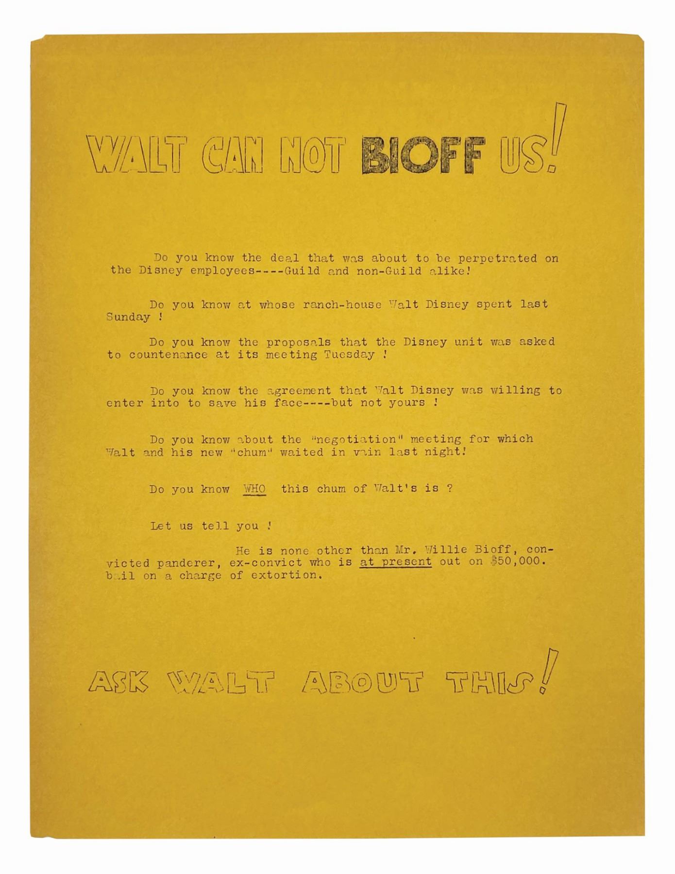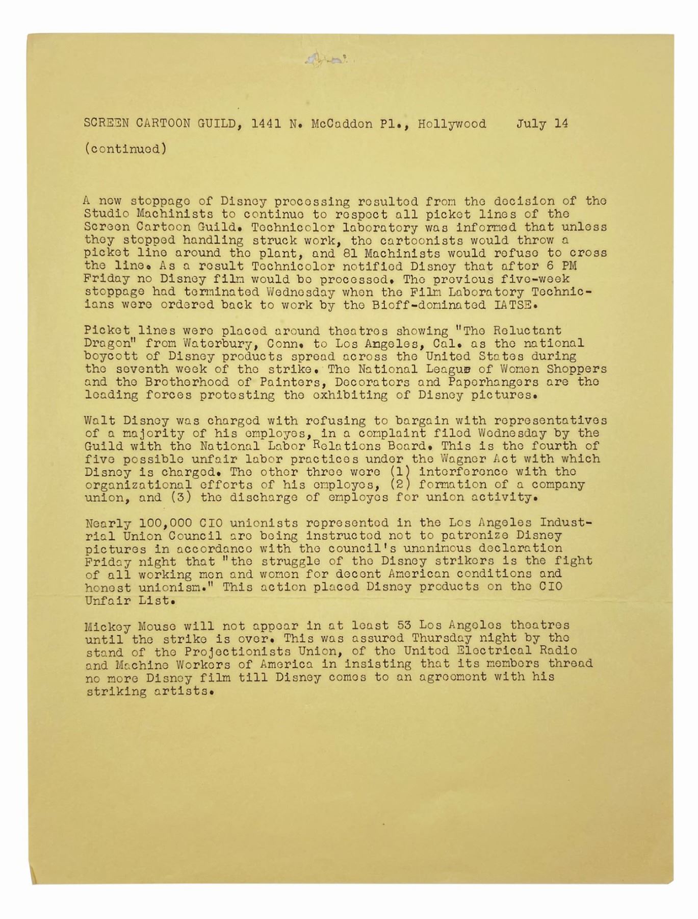(Disney, 1941) An incredibly rare archive of documents that were created and distributed during the historic Disney animator's strike of 1941. Following the Great Depression of the 1930s, there was a rise of union organization in Hollywood which included the creation of the Screen Cartoonist's Guild (SCG) in 1938. Many Walt Disney Studios employees were discontent with their pay and working conditions, citing an unclear pay structure between similar jobs and noticing preferential treatment and studio perks being only given to certain head animators and writers. Walt Disney's opinion, however, was that his studio's employees were some of the best paid in the industry, and with the move to the new Burbank studio in 1940, they enjoyed some of the best working conditions. As such, Disney refused on multiple occasions to come to terms with the SCG, feeling that it was his company to do with as he pleased. The disagreement came to a head when Disney fired several of his employees who were members of the guild. The following day, on May 29, 1941, over 200 employees of the Walt Disney Studios went on strike. The strike notably interrupted the production of Dumbo, which released in October of that same year, and Disney had some of his striking animators portrayed as circus clowns within the film as a small jab. With tensions rising, Walt left the studio for a goodwill tour of Latin America as part of the U.S. "Good Neighbor policy" during the early stages of production on the films Saludos Amigos and The Three Caballeros. Walt's absence helped tensions cool, and upon his return, he signed a union contract with the National Labor Relations Board. This archive includes (10) documents created and distributed during this historic strike. Many of the documents are written from the perspective of the strikers, and were used to inform both the studio's non-striking artists and the general public of the reasoning behind the strike, and also to paint Walt as the bad guy in the negotiations process. The documents are from various stages of the strike, with some mentioning Disney's outright refusal to let the United States government step in to help arbitrate the strike. The documents range in size from 3.5"x8.5" to 13.75"x8.5". The condition is good overall, with several fold-lines, small tears or wear around the edges, and scattered spots of discoloration from use. Original artifacts from this infamous part of Disney History are very scarce, with an archive of materials such as this being exceptionally rare.