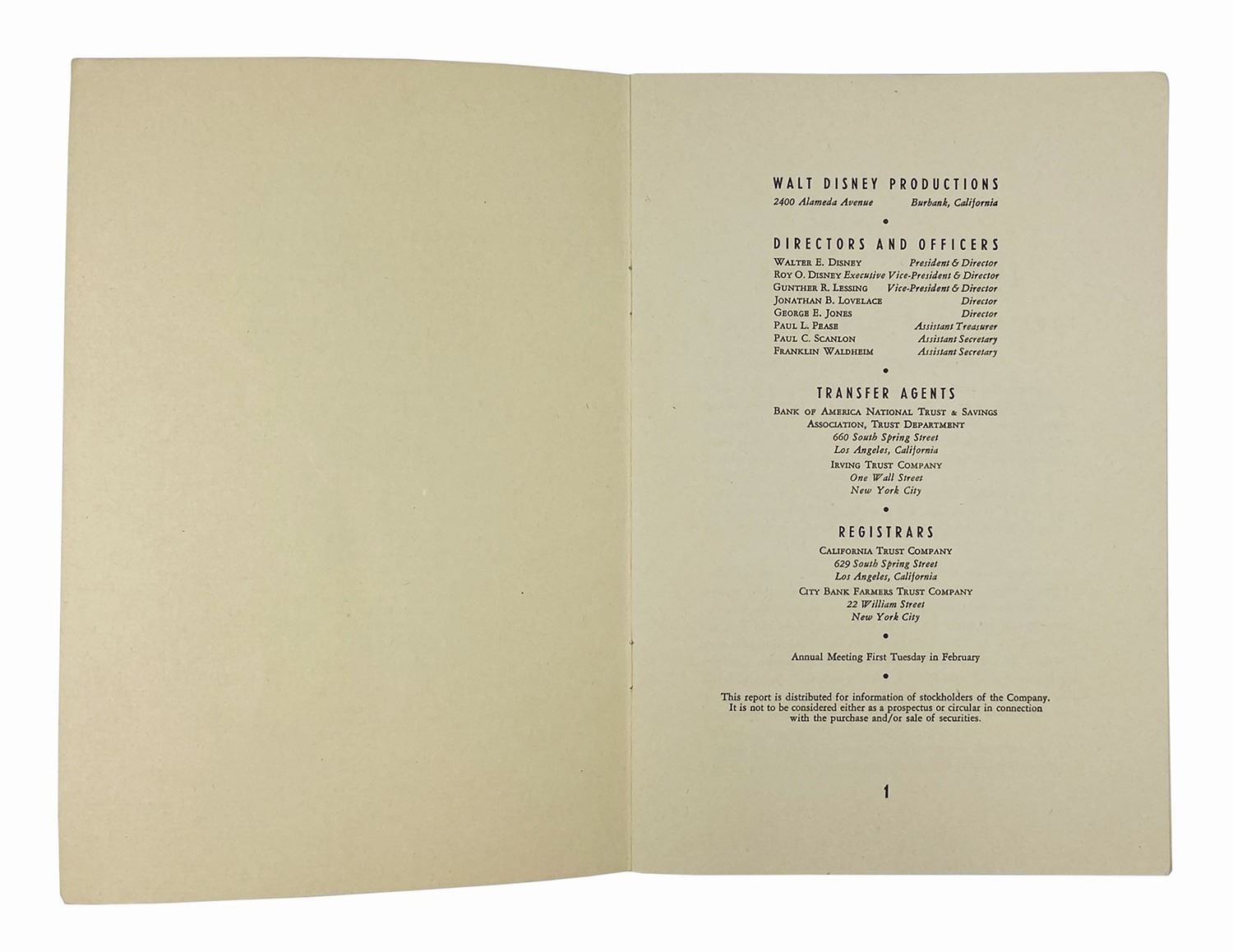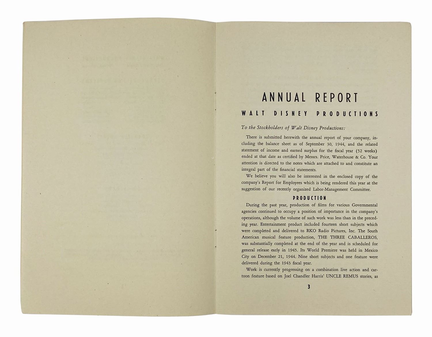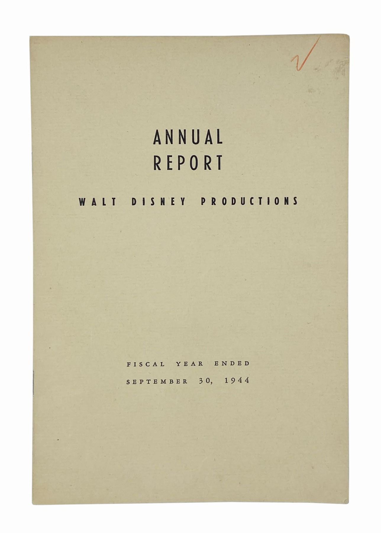 (Disney, 1944) An extremely rare Walt Disney Productions annual report for the fiscal year ending September 30th, 1944. At this time, Disney’s operations were almost entirely devoted to government contracts for propaganda and training films. Their 1944 release slate included a few original shorts and a reissue of Snow White, which was the company’s major source of income. The report also mentions work on a film based on the Uncle Remus stories, which would become Song of the South. Measuring 9”x6”, the 12-page booklet is in very good condition. It exhibits some browning from age, a “2” marked in red colored pencil on the cover, and minor handling.