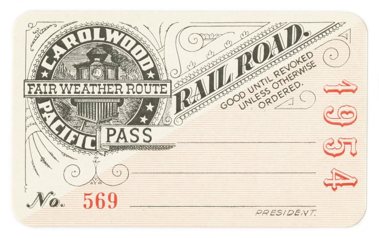 (Disneyland, 1954) A scarce souvenir pass for the Carolwood Pacific Railroad at Walt Disney's estate in Holmby Hills. These passes were printed exclusively for use at Walt's personal backyard railroad, and the front of the card includes a line at the bottom where Walt would sign his name. Due to the limited capacity of the ride and ongoing safety issues, no further cards were issued after 1953. The remaining passes for 1954-55 were stored at the Retlaw offices. This pass measures 2.25"x3.75" and is in very good condition with minor wear due to age.