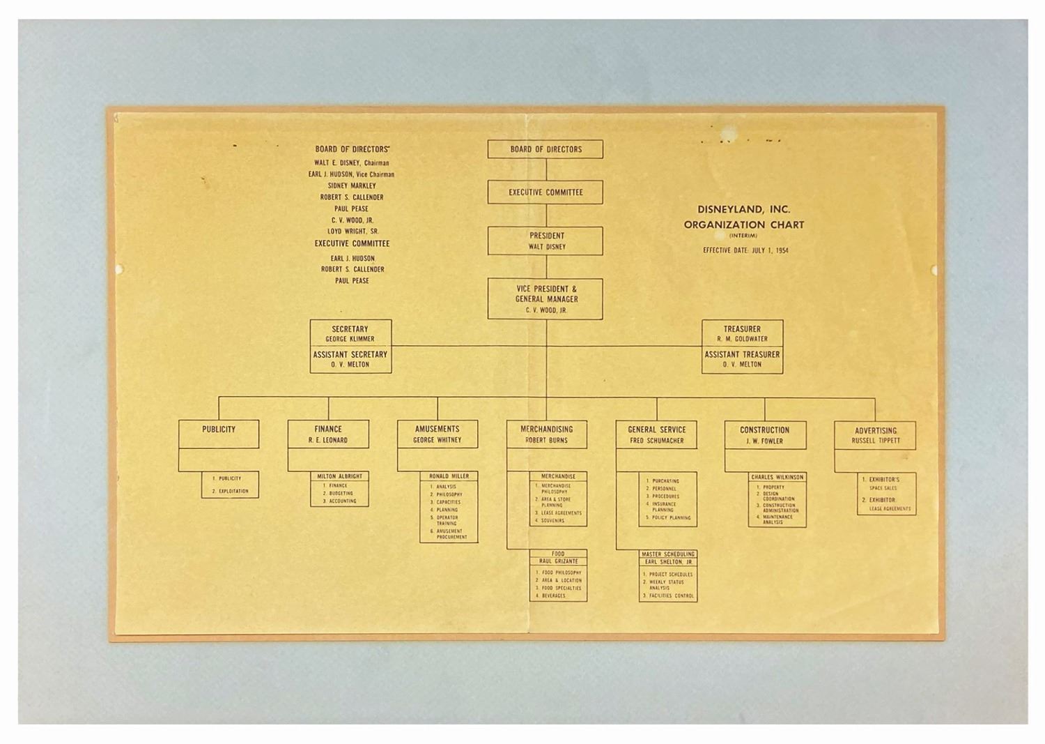(Disneyland, 1954) An extremely rare early organizational chart for Disneyland's management, dated July 1, 1954. The interim chart is said to be one of the earliest in the park's existence, and comes from the collection of Disney Legend Milt Albright. This chart was displayed in Albright's office for years, and was kept by Albright following his retirement. It features the names of the first 16 employees of Disneyland as well as the board of directors and executives committee. The chart is mounted to a thicker paper which itself is mounted to a larger mat board for display. The overall measurements are 15"x21", and the condition is good with expected wear from age and display. There are a few spots of discoloration to the chart, as well as some creases from prior folding.
