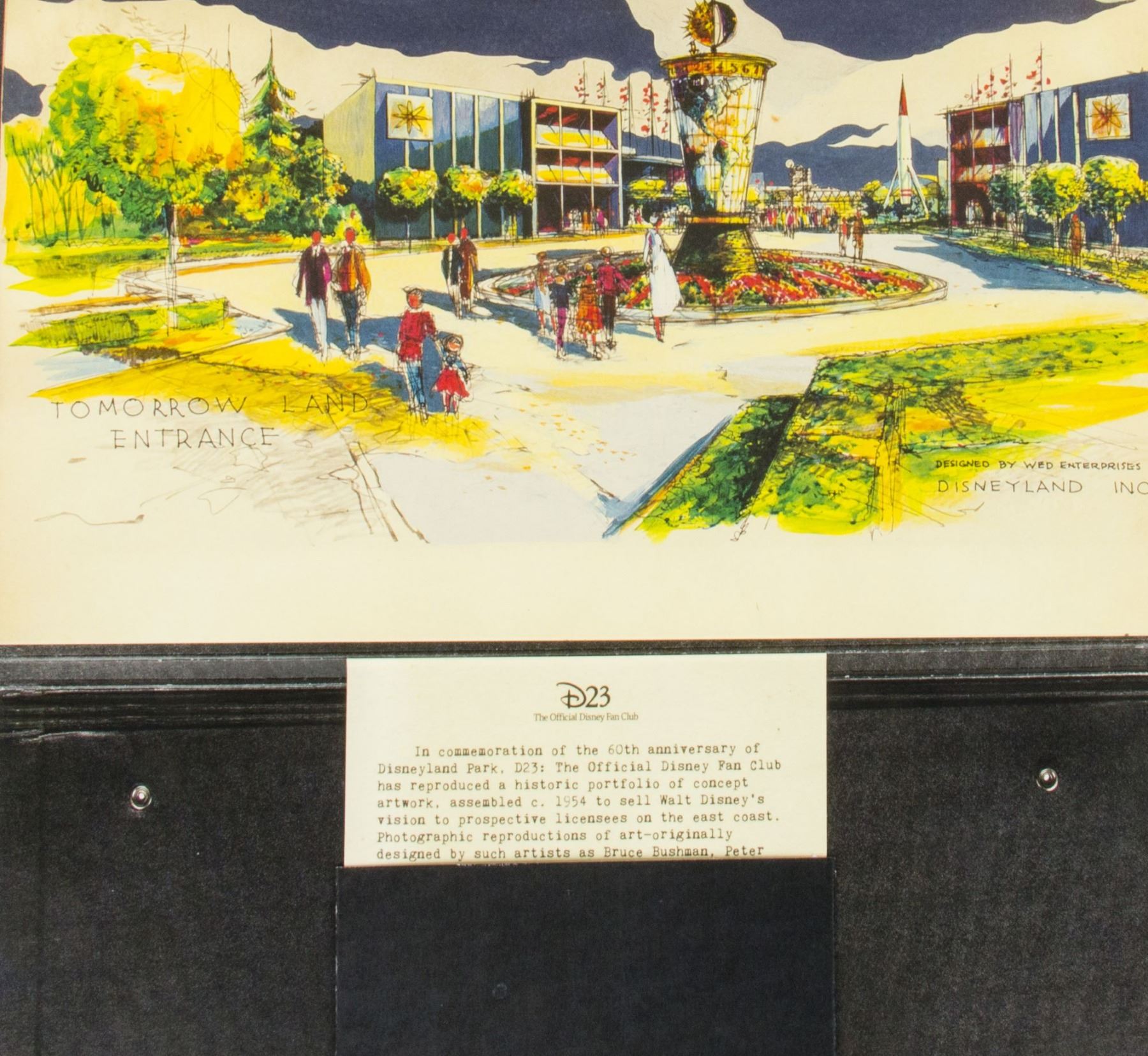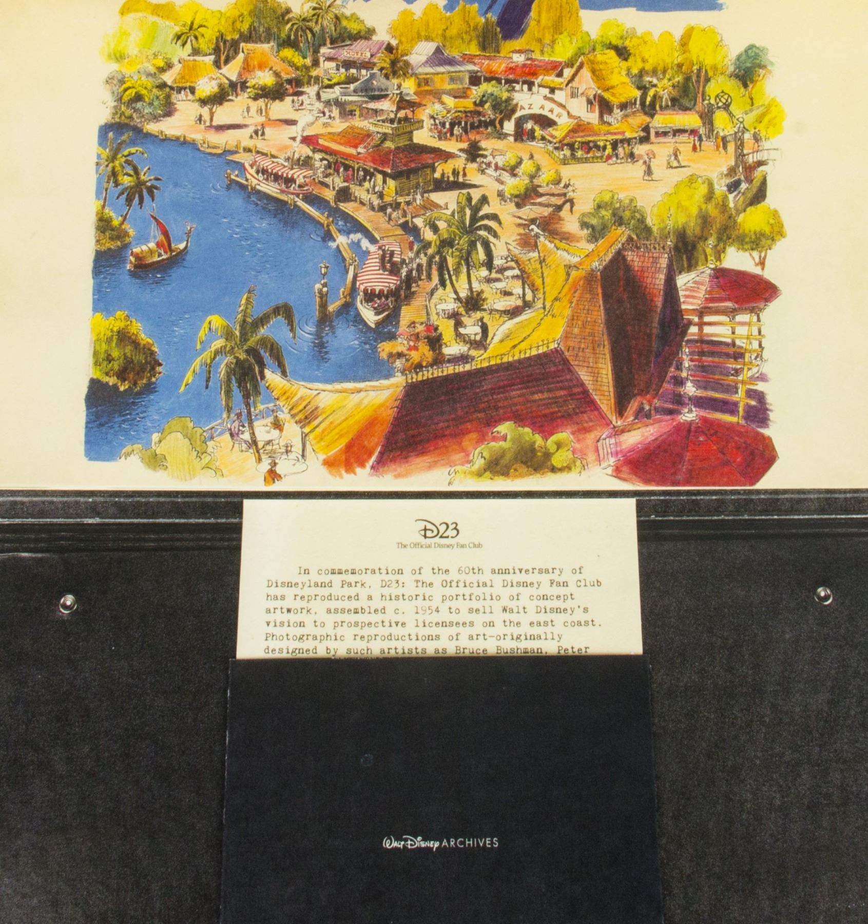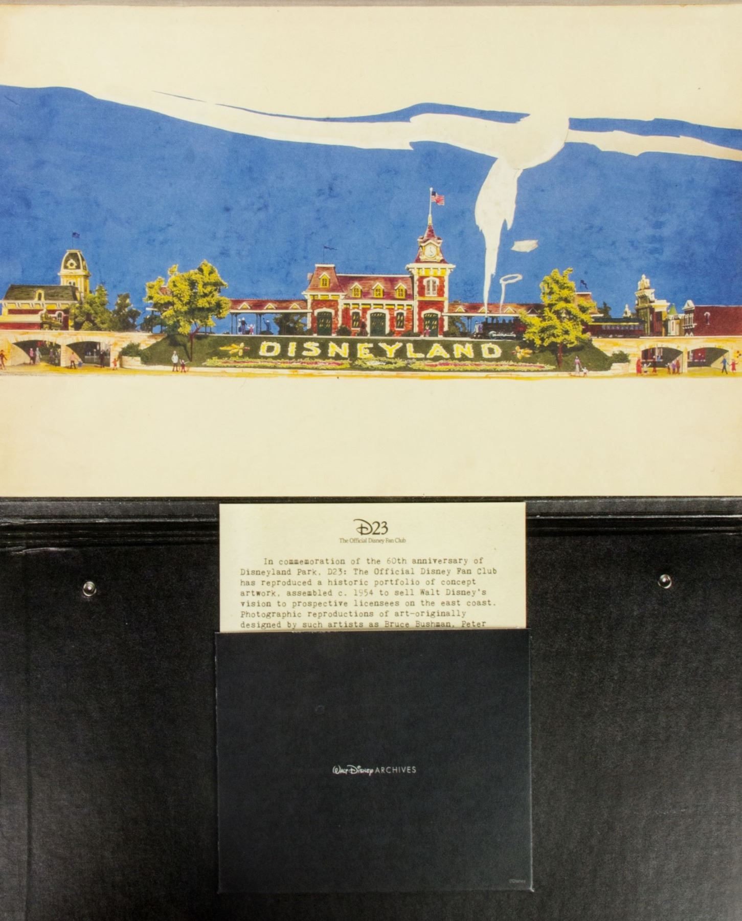 (Disneyland, 2015) Created exclusively for D23 members at the Gold level during Disneyland's 60th Anniversary, this stunning portfolio recreates an original Disneyland pitch portfolio from 1954. Included with this portfolio are 22 pages of reproduced concept artwork from such notable Imagineers as Harper Goff, Bruce Bushman, and Herb Ryman. The portfolio measures 9"x12" when closed, and the individual sheets measure approximately 8.5"x11.75". The portfolio is in very good condition with minor wear, and the portfolio has been given an intentionally distressed look to appear aged.
