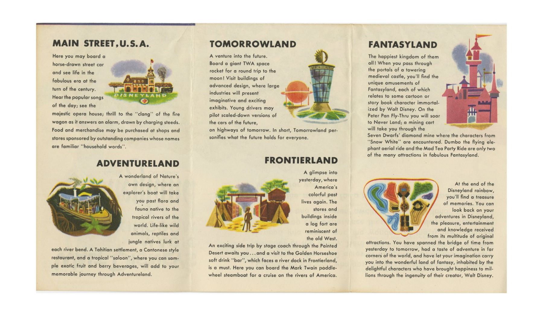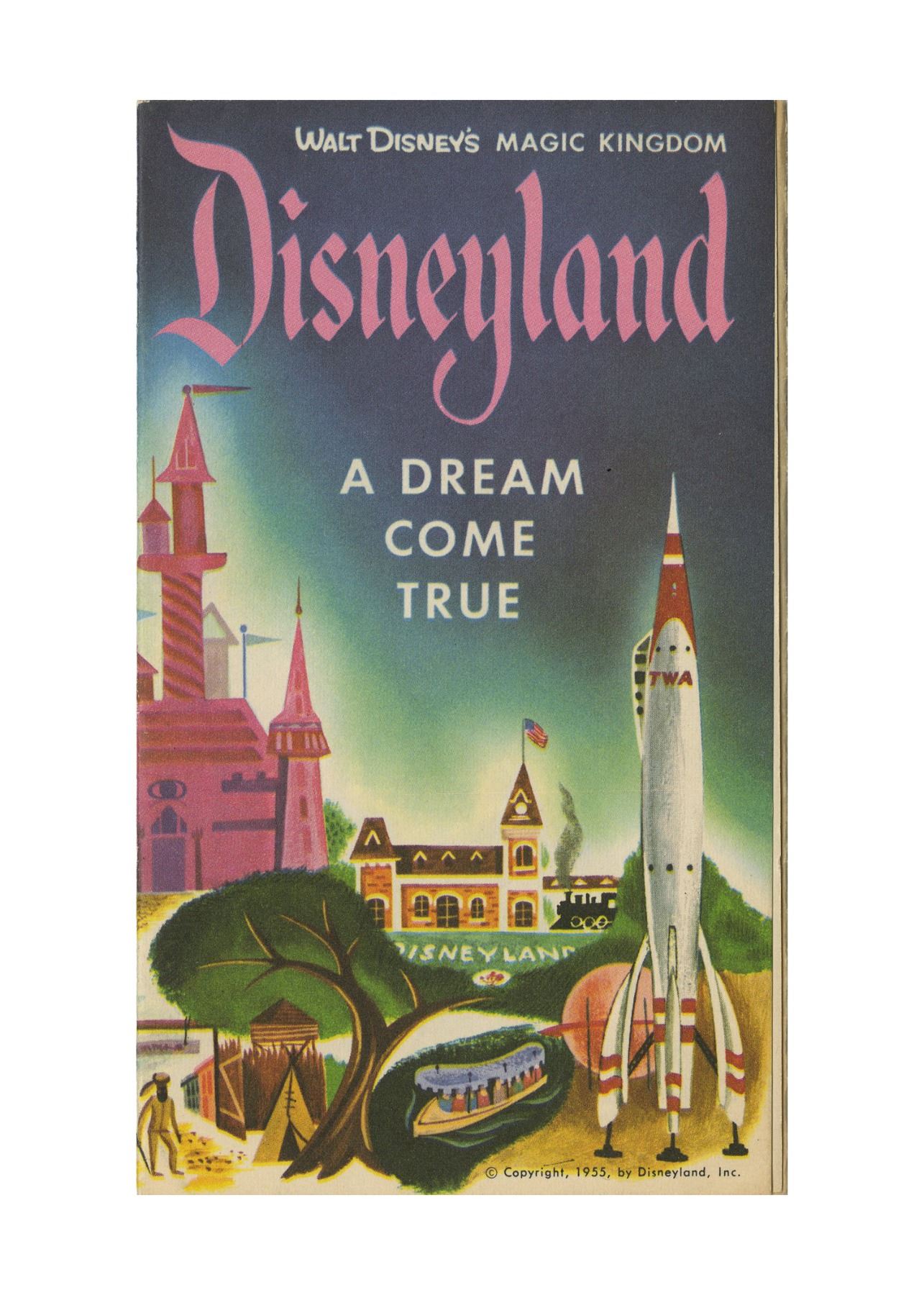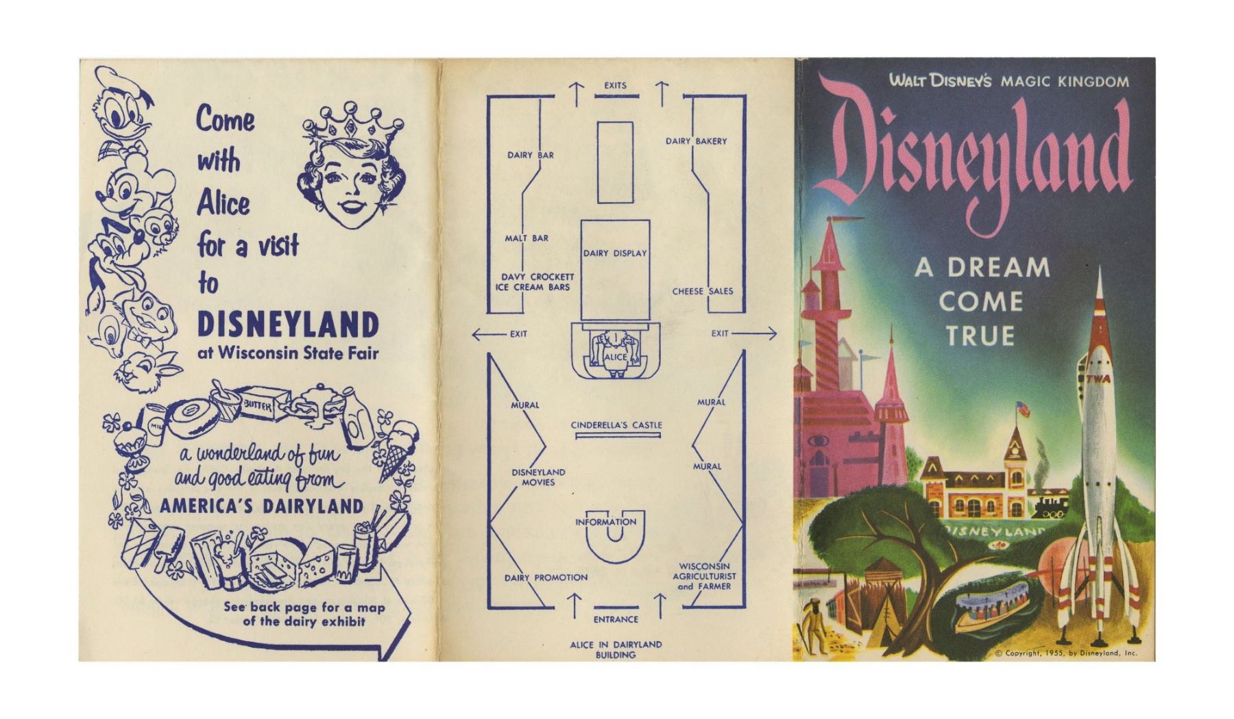 (Disneyland, 1955) A very rare Opening Year brochure created by Western Publishing for the promotion of Disneyland. The brochure features an illustrated park map inside, with additional descriptions of the different lands of the park. The back sides of these brochures would promote a variety of companies and sponsors of Disneyland including TWA, Blue Bird Shoes, Dutch Boy Paints, and several others. This particular very rare variant promotes "Alice in Dairyland" at the Wisconsin State Fair, and has a charming diagram of the layout of the exhibit, which included a "Cinderella's Castle" display, "Disneyland Movies", and "Davy Crockett Ice Cream Bars", among other displays. The pamphlet measures 6"x3.5" when folded, and is in very good condition.