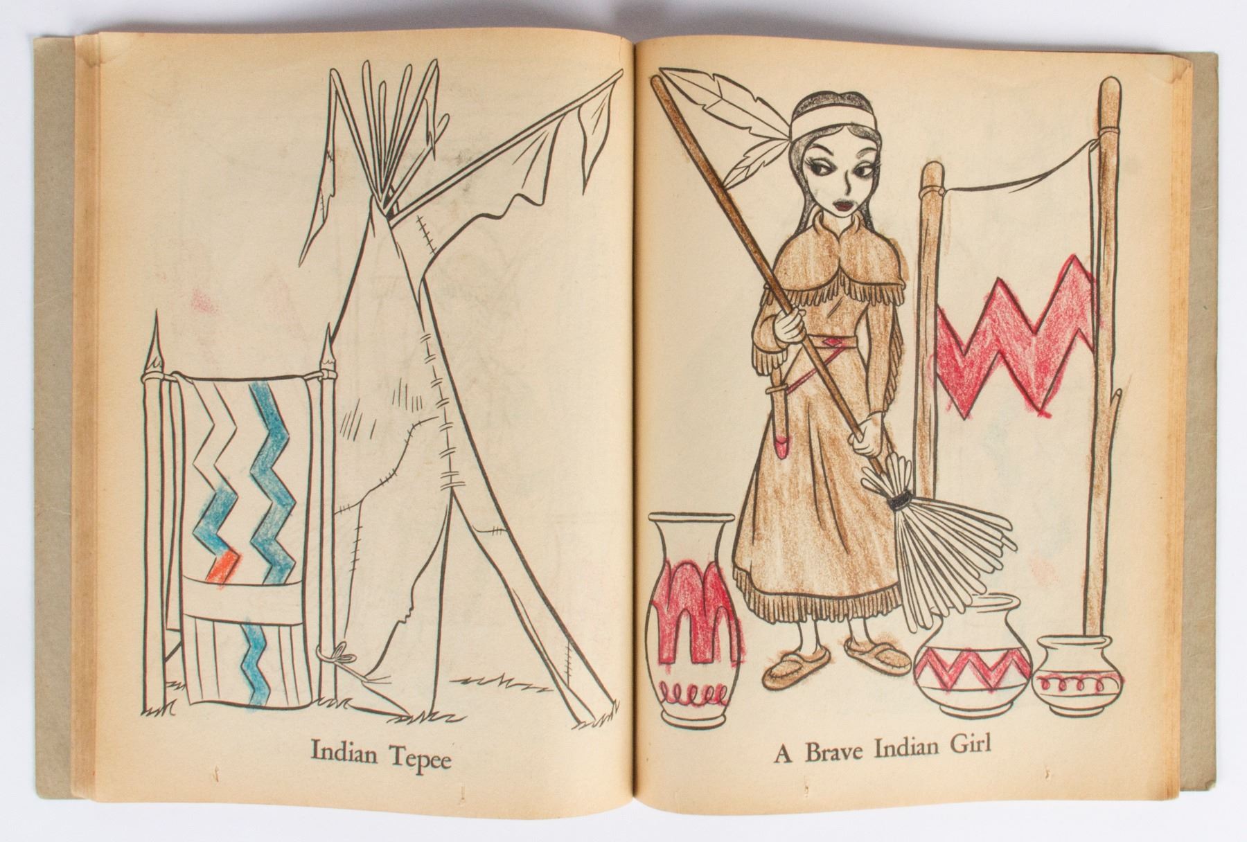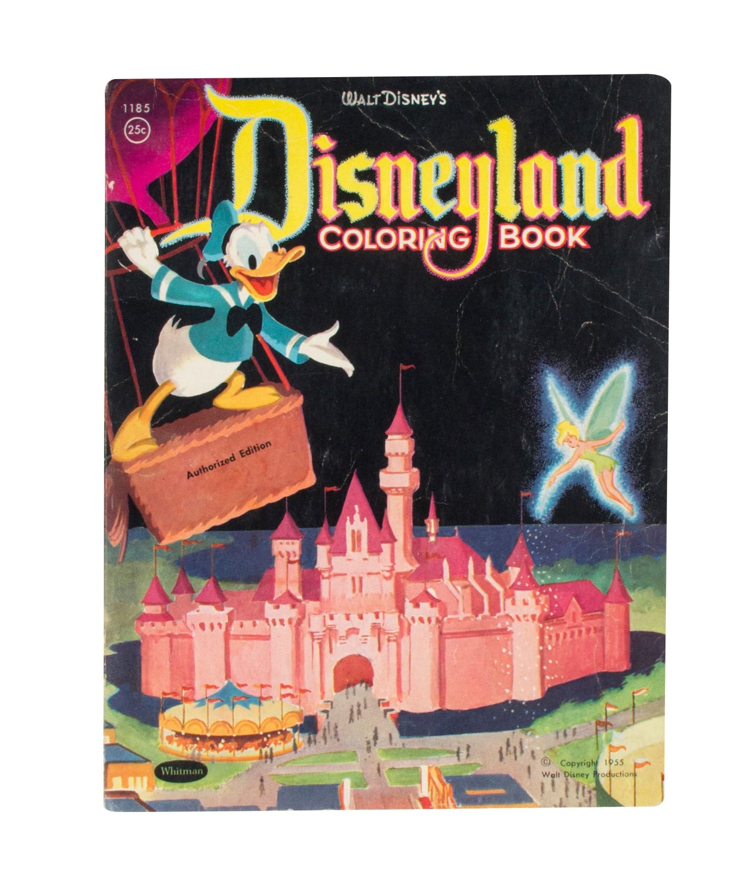 (Disneyland, 1955) This "Disneyland Coloring Book" by Whitman Publishing was created for the park's opening year, and features a beautiful cover image of Sleeping Beauty Castle. Depicted throughout the book are various characters and attractions guests would find at Disneyland during its opening year including Mickey, Pecos Bill, the Carousel, Autopia, and much more. Measuring 11"x8.5", the book is in fair to good condition with some wear from use including a number of pages that have been colored.