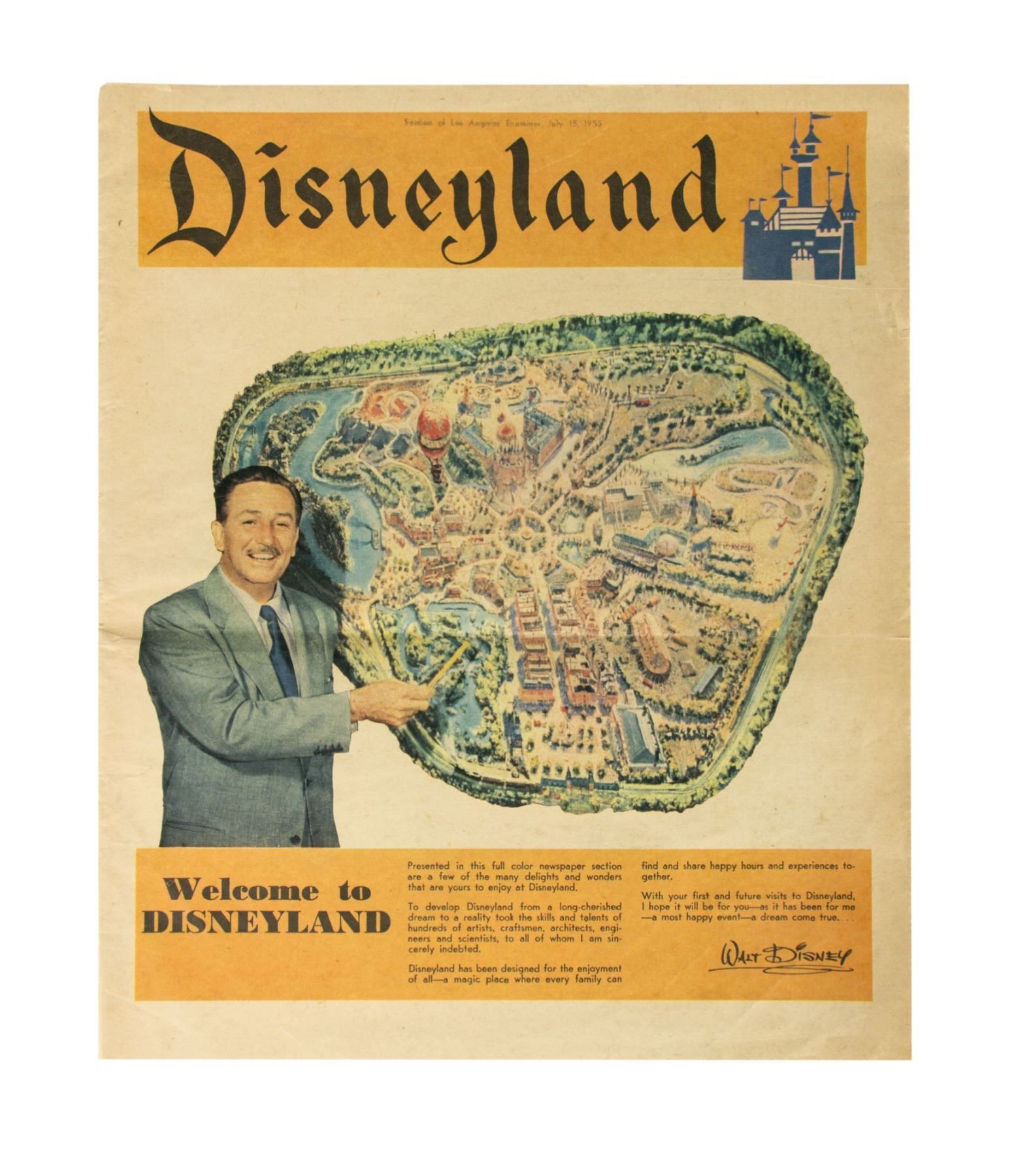 (Disneyland, 1955) This gorgeous 20-page newspaper supplement, dated July 15th, 1955, was issued by California area newspapers two days before the Grand Opening of Disneyland in order to promote the new park. The supplement measures approximately 10.75"x13.25" and is in good condition with expected wear and minor creasing.