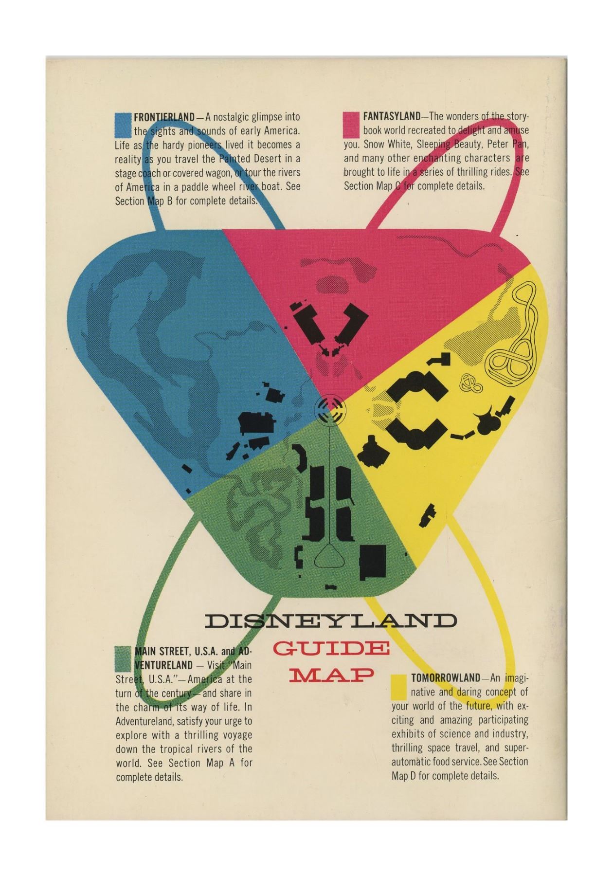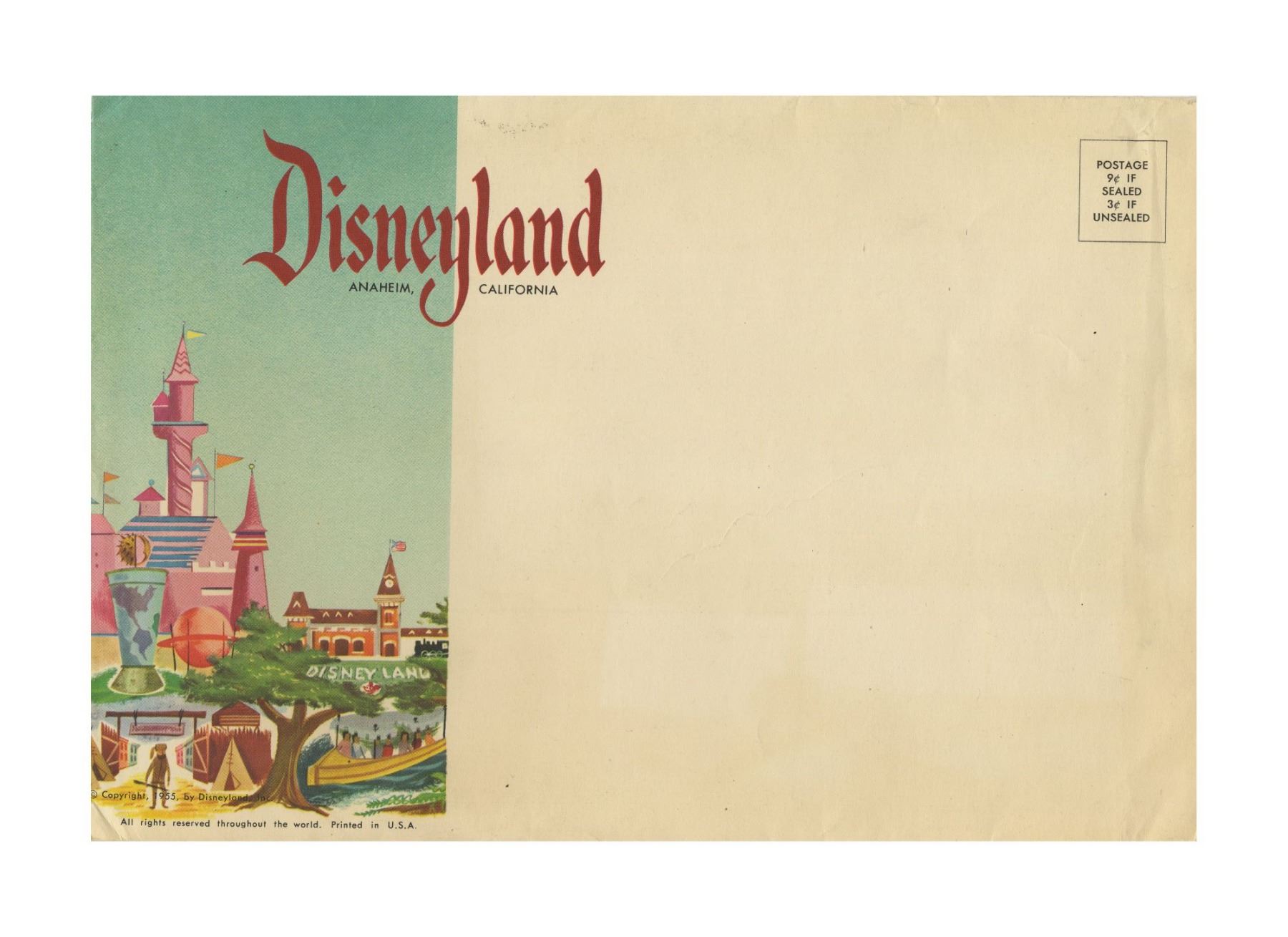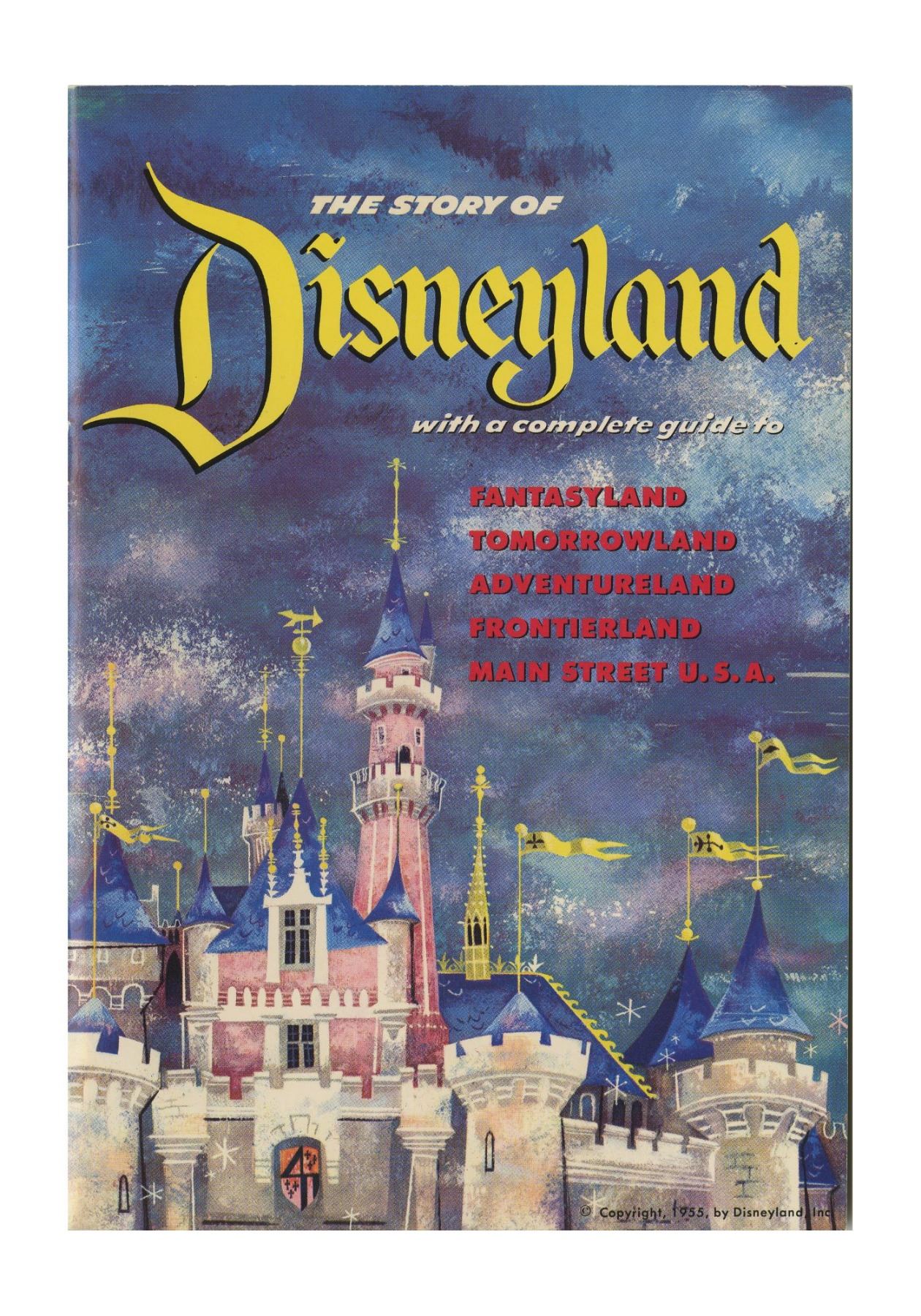 (Disneyland, 1955) A beautiful Opening Year guidebook featuring information and illustrations of the different lands of the park. Titled "The Story of Disneyland", this was the first guidebook issued by the park. It contains concept art of the attractions and lands as opposed to later guidebooks which would feature actual photos of the park. This 22-page guidebook measures 8.75"x6" closed, and is in very good condition with minor wear. Also included is the very scarcely seen unused mailing envelope with great vintage graphics on the front.