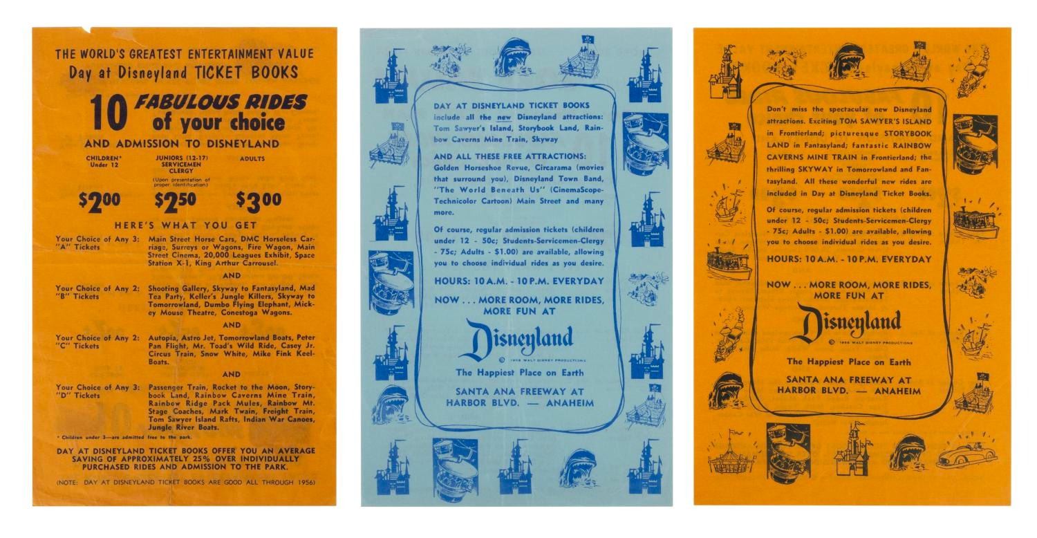 (Disneyland, 1956) Three rare ticket gate fliers promoting the new "Day at Disneyland" Ticket Plan and Ticket Books. These double-sided fliers given to Guests at the Main Gate Ticket Kiosks feature Admission Prices, a list of rides included, and Park hours. Measuring 5.5"x8.5", these fliers are in very good condition with spots of color fading and few light creases.