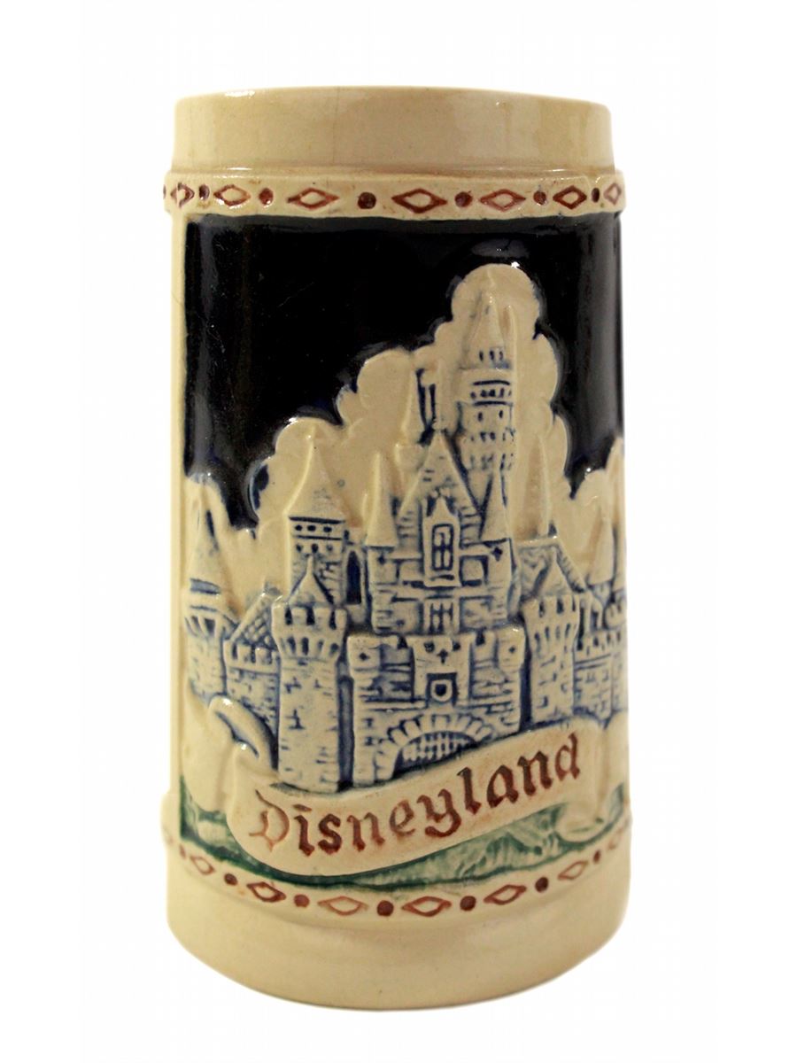 A beautiful decorative stein featuring imagery from the different lands at Disneyland. Made in Germany, with detailed embroidery. Colors have held up well over time. Stein could benefit from a light cleaning, but it is in good condition with minimal wear. Measures 5.5" tall and roughly 3" in diameter.