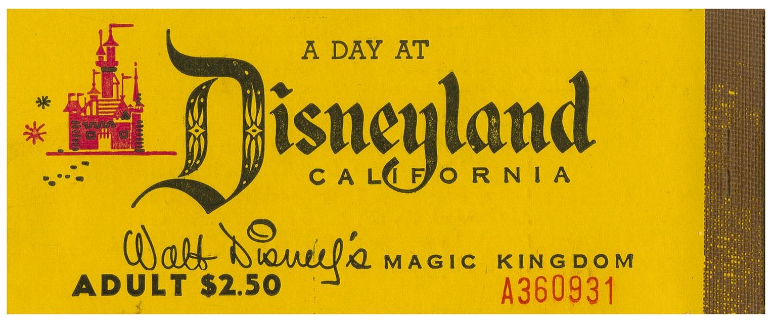 (Disneyland, 1956) A Disneyland ticket book from the first half of 1956. Later in 1956, the "D" tickets were introduced and the ticket designs were modified slightly, but this earlier ticket book was created before the use of "D" tickets. This book still retains the "A" and "B" tickets along with the back-cover. Measuring 2"x5", the ticket book is in good condition with some yellowing to the left-side of the "A" ticket.