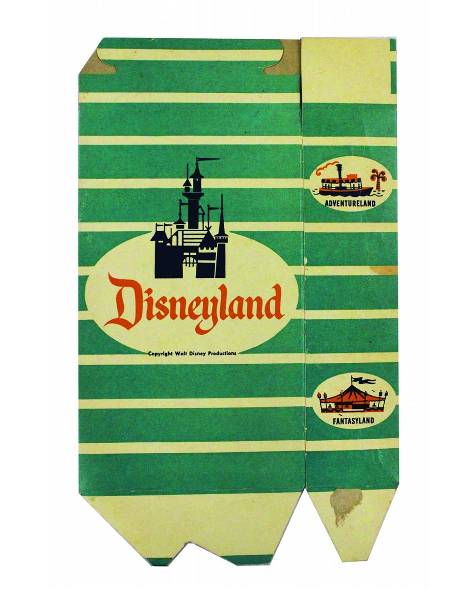 (Disneyland, 1956) A very rare, original Disneyland 1956 popcorn box in a beautiful vintage striped green and white. These simple graphics gorgeously represent the charm of iconic Disneyland design, even to the extent that a limited edition ceramic replica was made in honor of the originals. Measures 7"x4.25". In very good condition with minimal edge wear and discoloration spots.