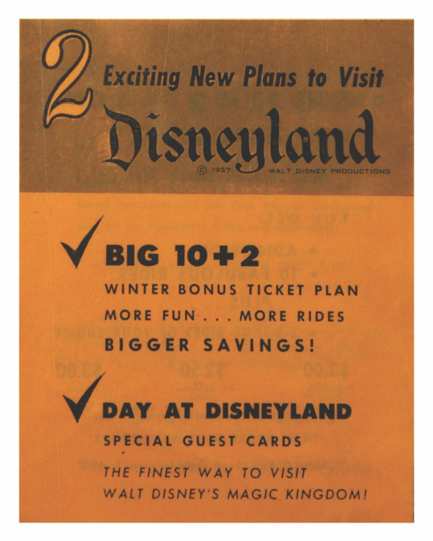 (Disneyland, 1957) A very rare gate flyer from Disneyland that discusses "2 Exciting New Plans to Visit Disneyland". The promoted options include the "Big 10 + 2" ticket plan, and the "Day at Disneyland Special Guest Cards". Few of these early promotional materials were kept, and with this rare flyer measuring 5.5"x4.25" when unopened. The condition is very good.