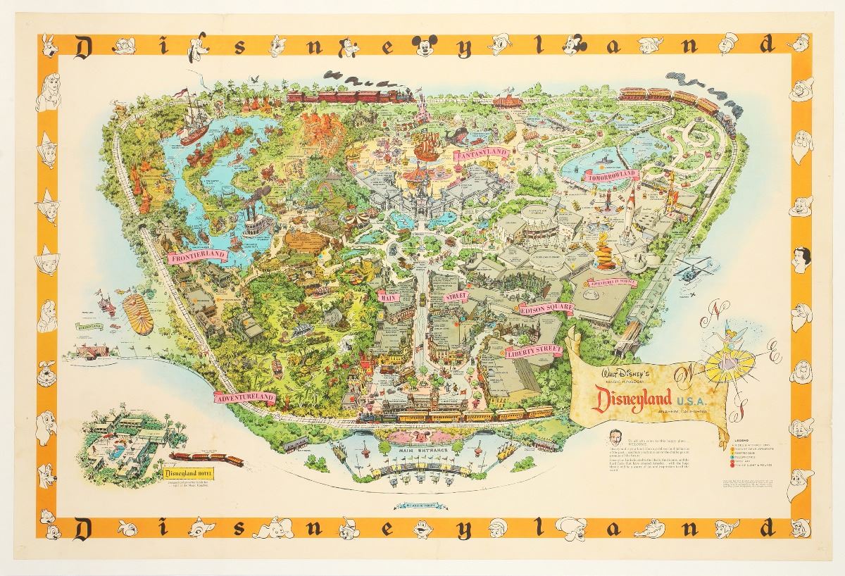 (Disneyland, 1958) Ultra-rare 1958 "A" version Disneyland souvenir map. The absolute first of the highly coveted, poster-sized souvenir maps by Disney Imagineer, Sam McKim. Although marked "Copyright 1958", this early map was actually sold for a short period in the Summer of 1957. It pre-dates the key 1959 park additions featured on all forthcoming maps of the period, such as the "Matterhorn" and Monorails. In their place are early attractions such as the "Viewliner", "Snow Mountain" and "Junior Autopia". An extremely rare map. Measures 30"x45". Mounted on linen and in very good condition.