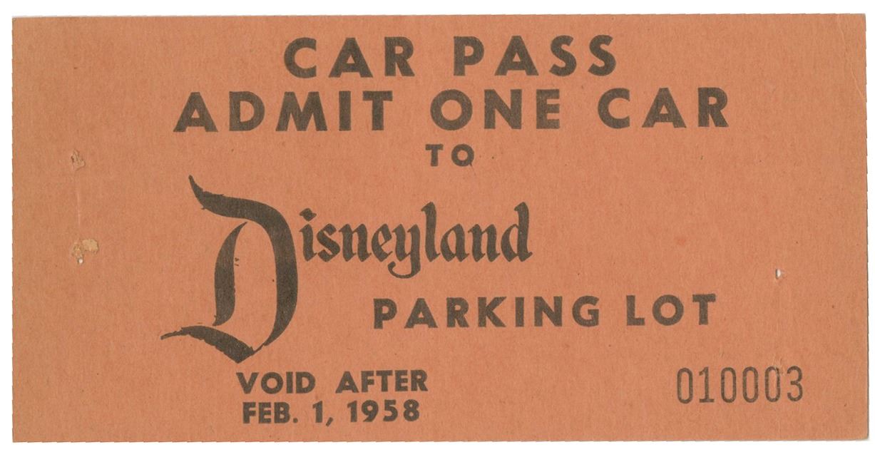 (Disneyland, 1958) A very early Disneyland car pass that is marked, "void after FEB. 1, 1958" and is numbered 010003. The car pass measures 2"x4" and is in very good condition with minor wear, and has staple holes on each side of the pass.
