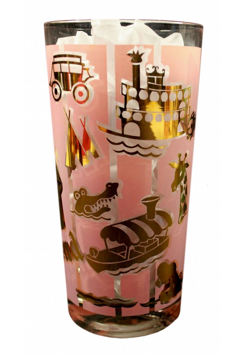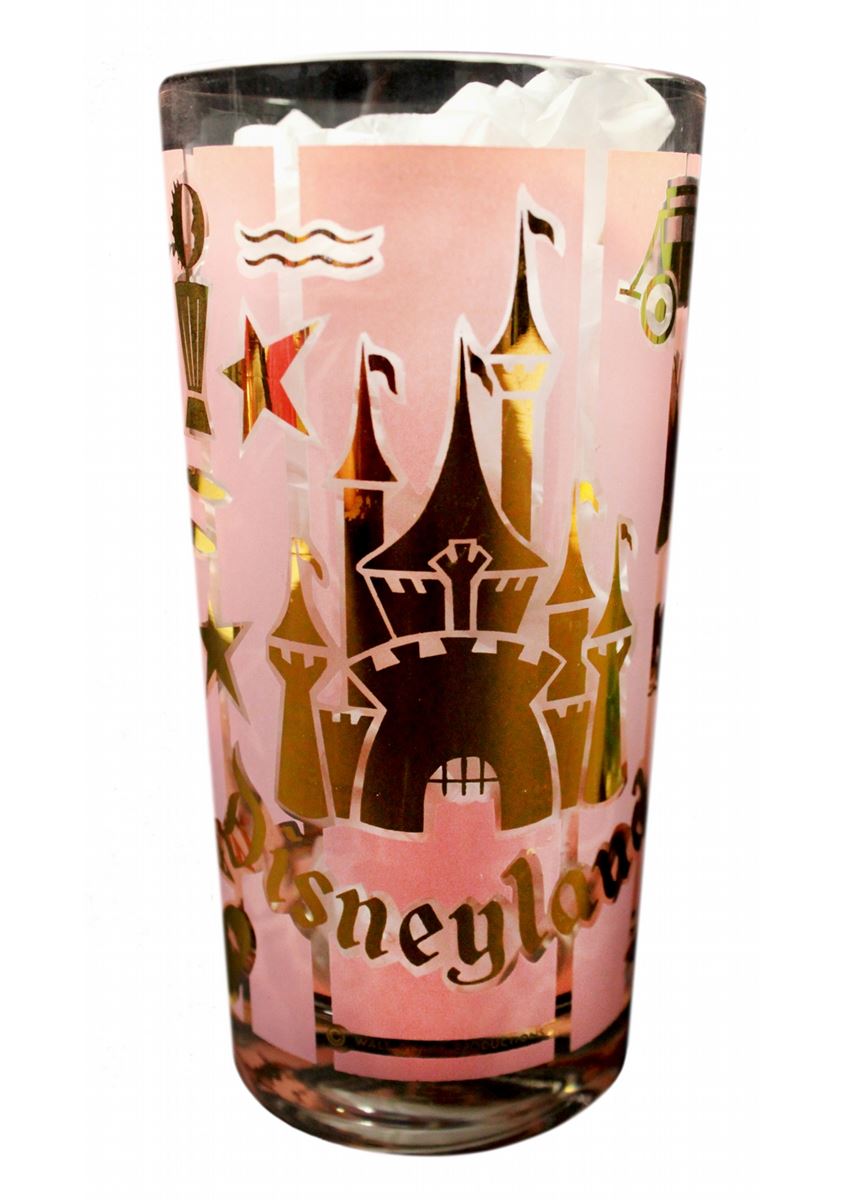A beautiful drinking glass from Disneyland featuring iconic imagery from the different lands at the park. This piece is exceptionally rare and made of glass. In great condition, with no chips in the glass, but some wear to small aspects of the color. Measures 5.5" high and 2.75" in diameter.