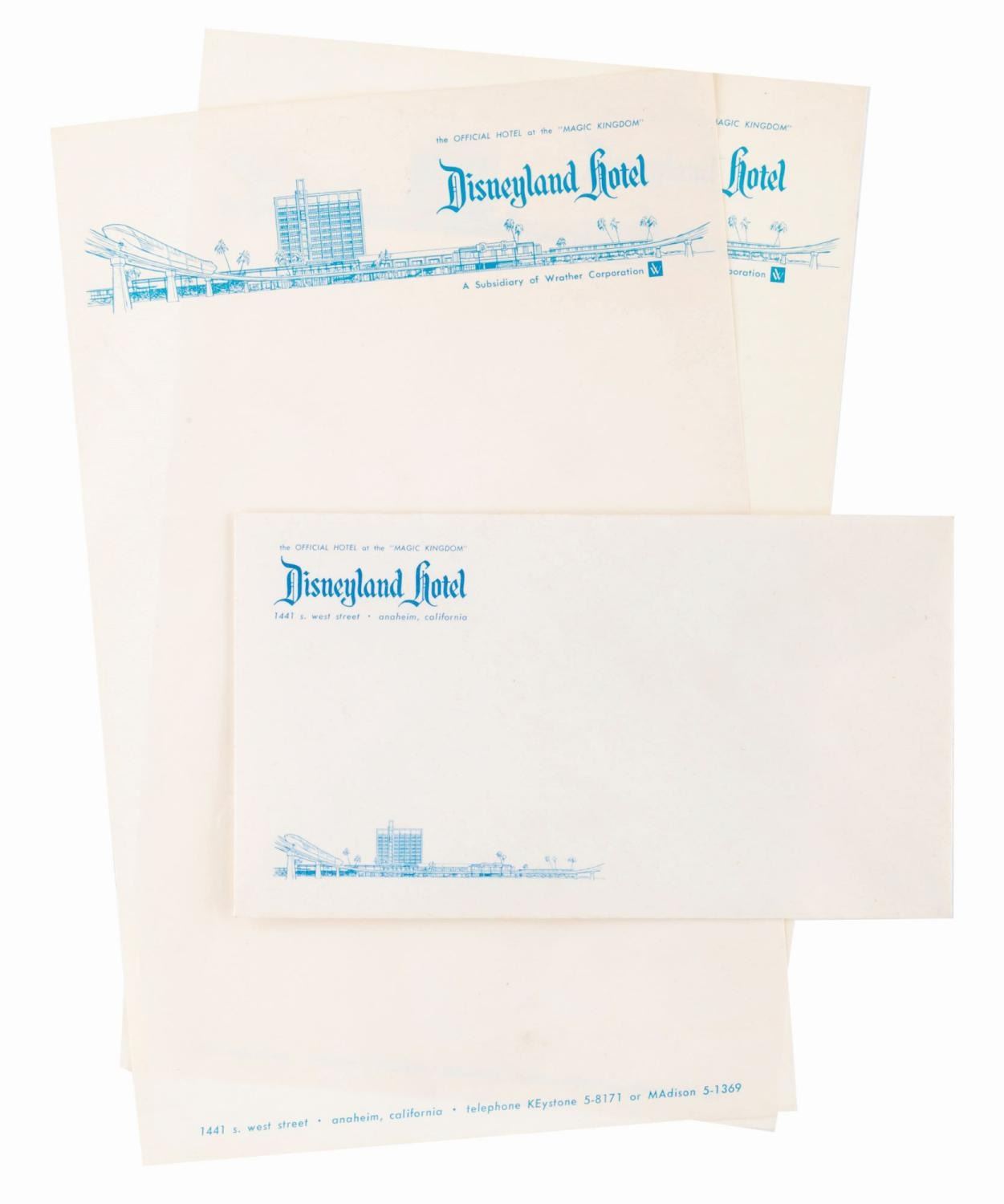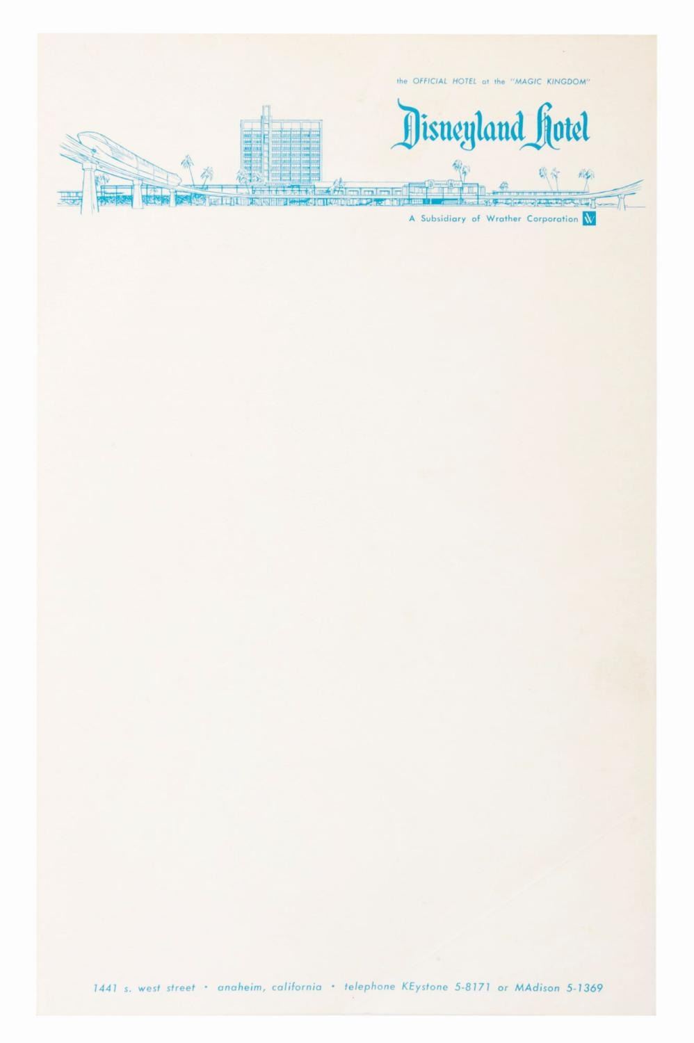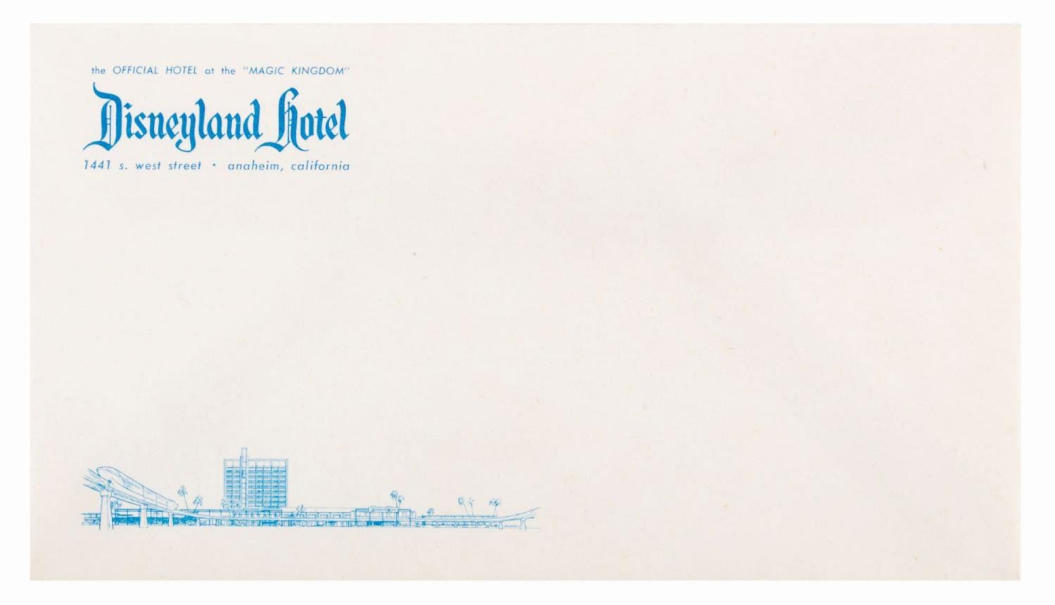 (Disneyland Hotel, 1961-65) A piece of letterhead and an envelope from the Disneyland Hotel. The stationery is in very good condition, slightly off-white from age.