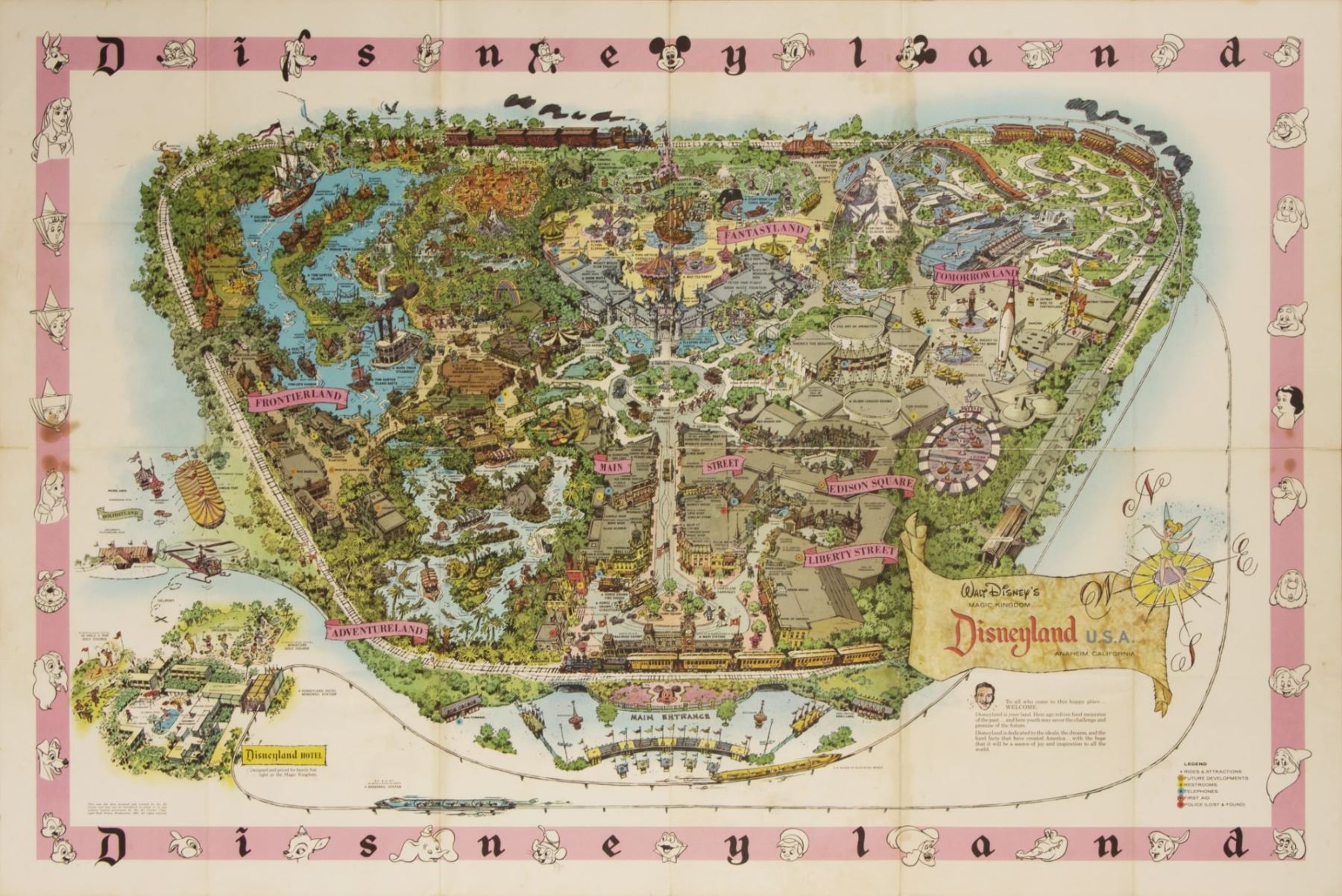 (Disneyland, 1961) A large souvenir map of Disneyland from 1961. This version of the Sam McKim designed souvenir Disneyland map features a pink border with Disney characters. In this version, the Monorail extends to the Disneyland Hotel for the first time, and the Flying Saucers attraction makes its first appearance. The map measures 30"x44.75" and is in fair condition with heavy wear along the fold-lines, including some 2"-3" tears along intersections at the center fold. There is staining near the center fold on the left and right borders, as well as some discoloration near the top of the map. There is some edge-wear, including small tears.