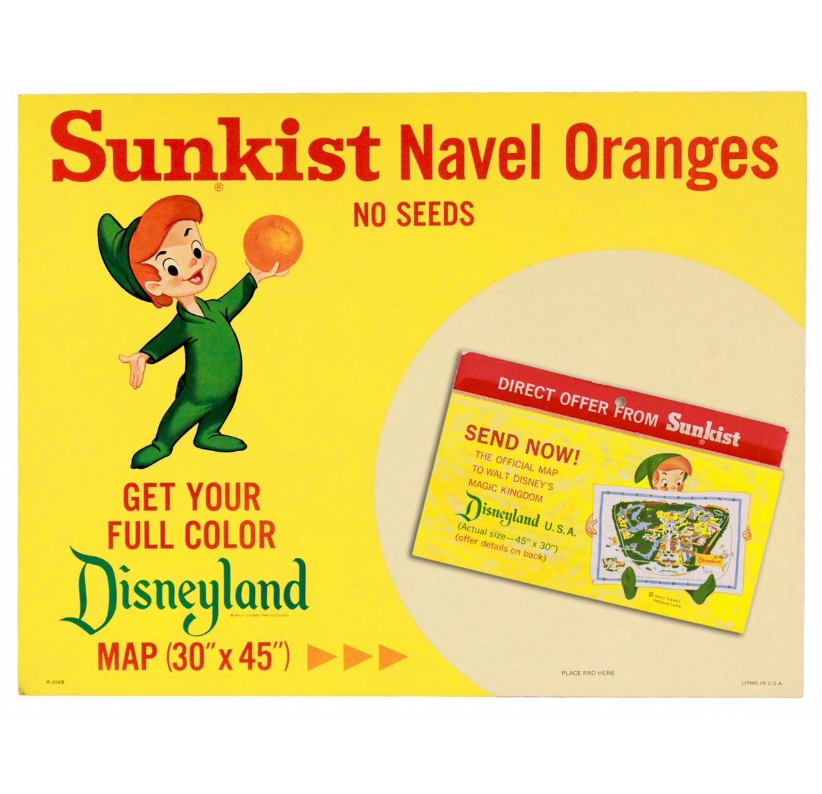 Extremely rare display kit for Sunkist retailers offering mail-in maps of Disneyland. The kit contains a large 41"x28" poster, unused mail-in coupons for the map, an advert for the coupons, and a folder for the retailers. Good condition overall, with mild amount of edge-wear and surface wear to the pieces. A great collection of several related pieces that help show the fervor Disneyland brought to the general public.