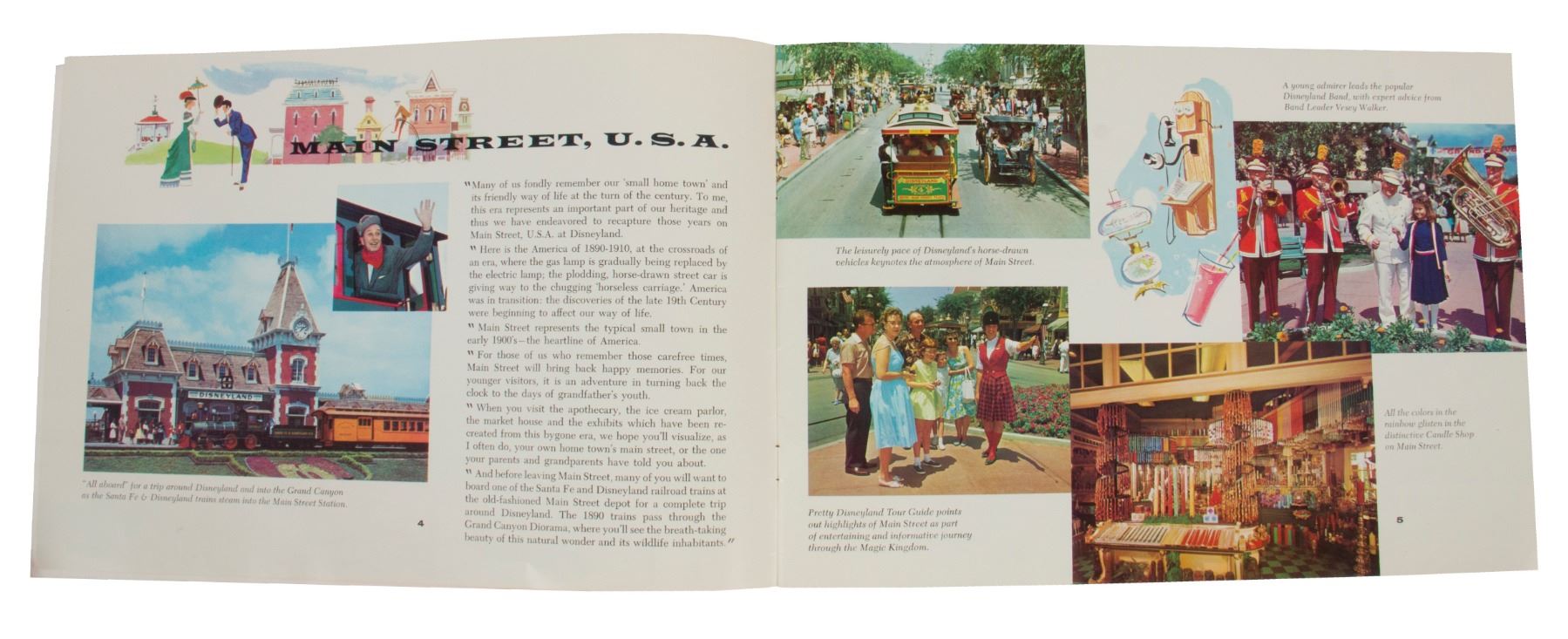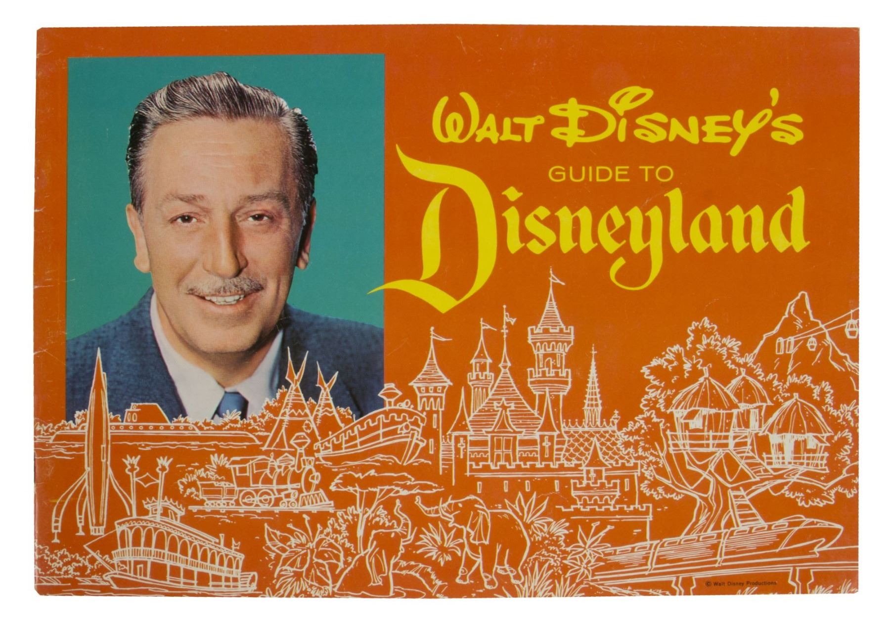 (Disneyland, 1963) A rare Disneyland guidebook from 1963. This guidebook provides a wealth of information regarding the lands and attractions of the park in 1963. Of particular note is the inclusion of the "Enchanted Tiki Room" which debuted that year, as well as a page of "coming attractions" which promoted New Orleans Square's soon to open "Haunted Mansion" and "Pirates of the Caribbean". Measuring 8"x11.5", the guidebook is in very good condition with some wear to the spine from use.