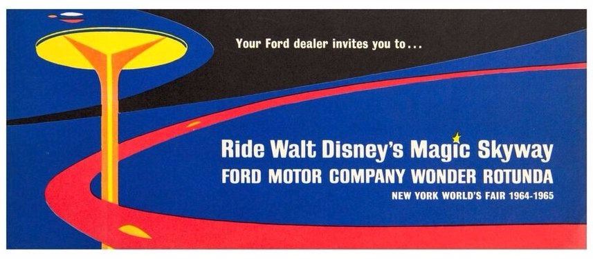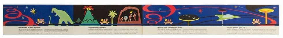 (World's Fair, 1964-65) A rare brochure for Walt Disney's "Magic Skyway" in the Ford Wonder Rotunda at the 1964-65 New York World's Fair. This brochure opens up length-wise to reveal a large double-sided pan image based on scenes in the attraction. This item measures 4"x37" opened, and is in very good condition with minor wear.