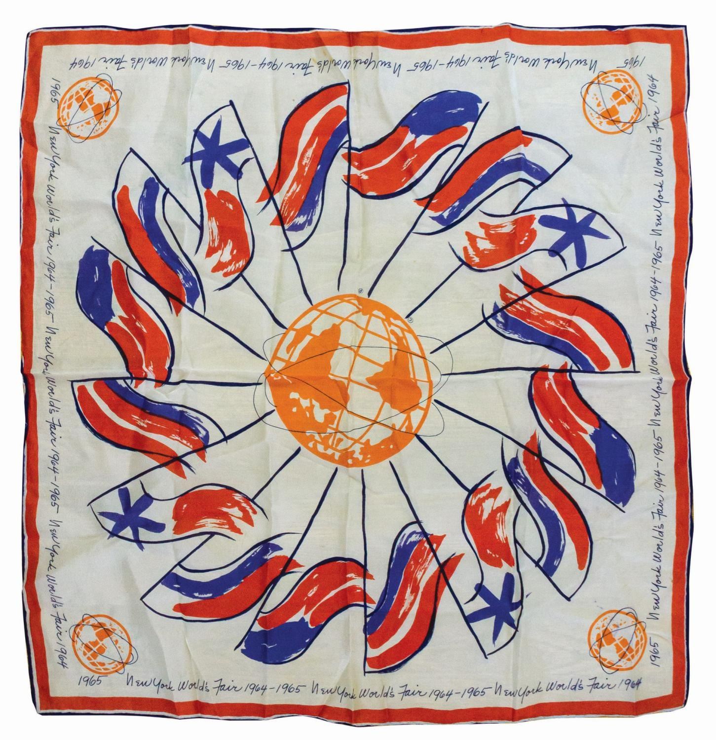 (World's Fair, 1964-65) A souvenir scarf from the 1964-65 New York World's Fair. The synthetic fabric scarf features a large central graphic of the Unisphere, the official logo of the fair, surrounded by stylized national flag representing participant countries from around the world. Measuring 27"x28", the scarf is in good condition with tiny holes, threadbare areas around the edges, and scattered spot discoloration from age.