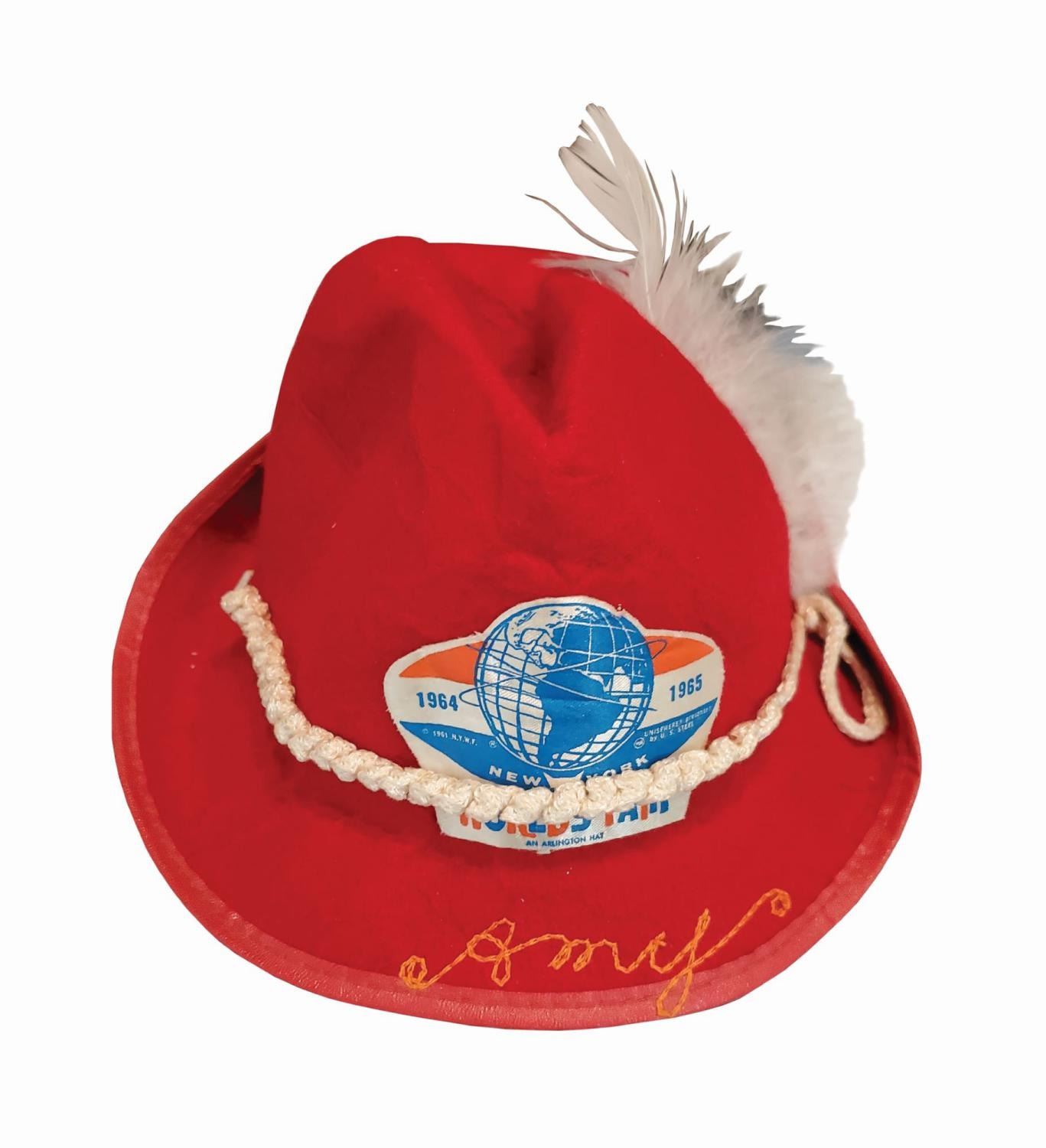 (World's Fair, 1964-65) A child's hat from the 1964-65 World's Fair. This hat features' the original World's Fair logo, a feather, and has the name "Amy" stitched into the brim. The hat is child size and is in fair condition with creasing and wear throughout from use over time.