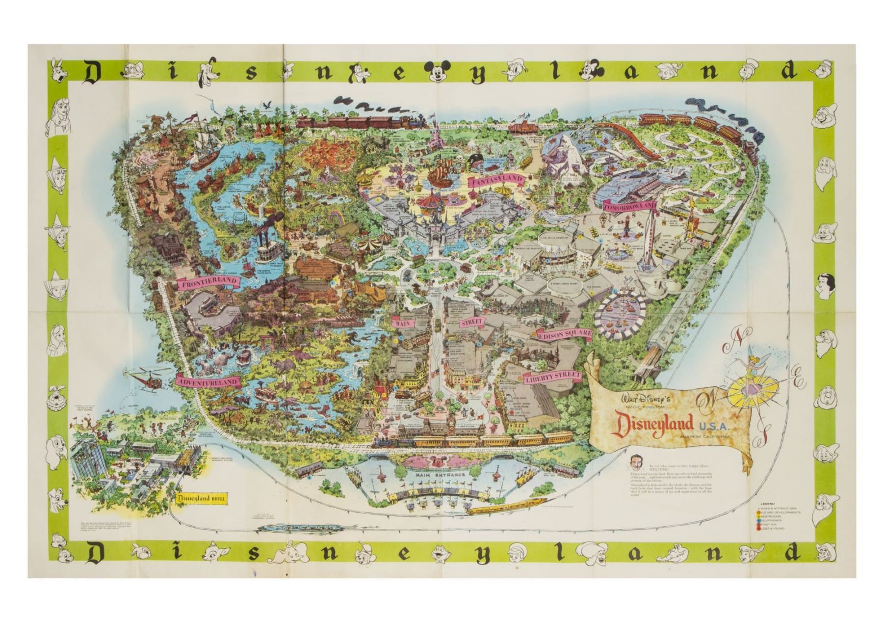 (Disneyland, 1964) A souvenir Disneyland map from 1964 that features a stylish depiction of the park as well as a few new changes from previous park maps, including the removal of the "Holidayland Circus" attraction, relocating the tour guides next to Town Hall, and more. The map measures 30"x45" and is in good condition with some wear along the original fold lines and a few scattered spots of discoloration from use.