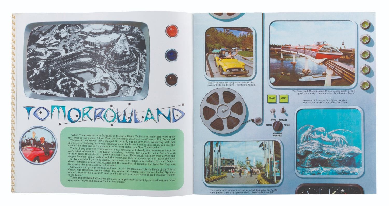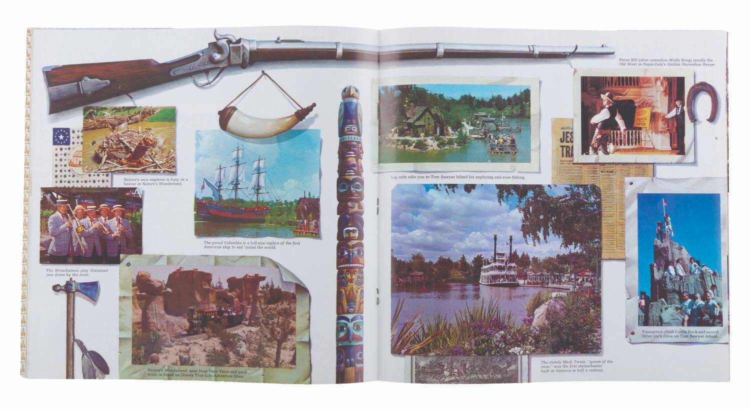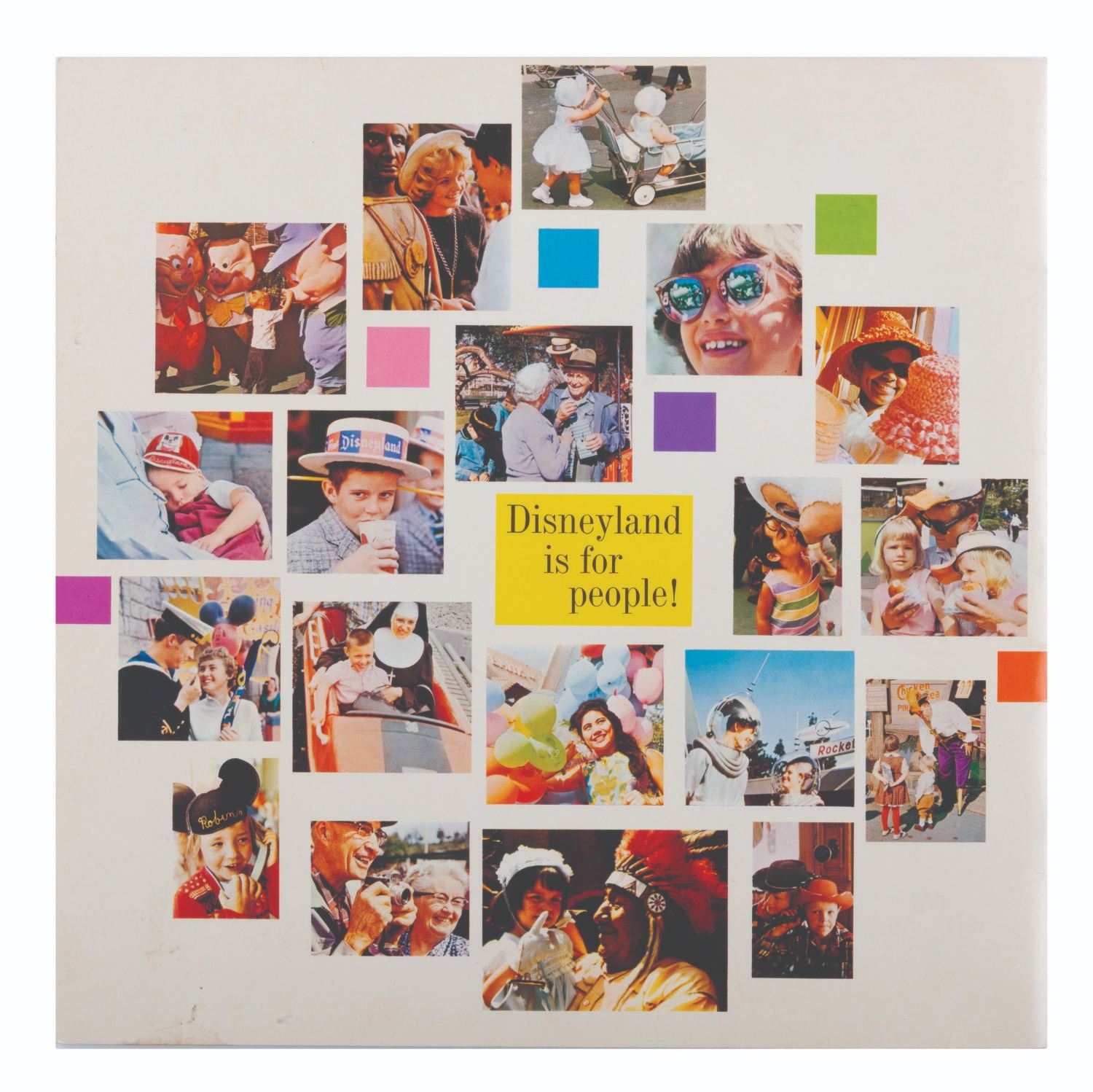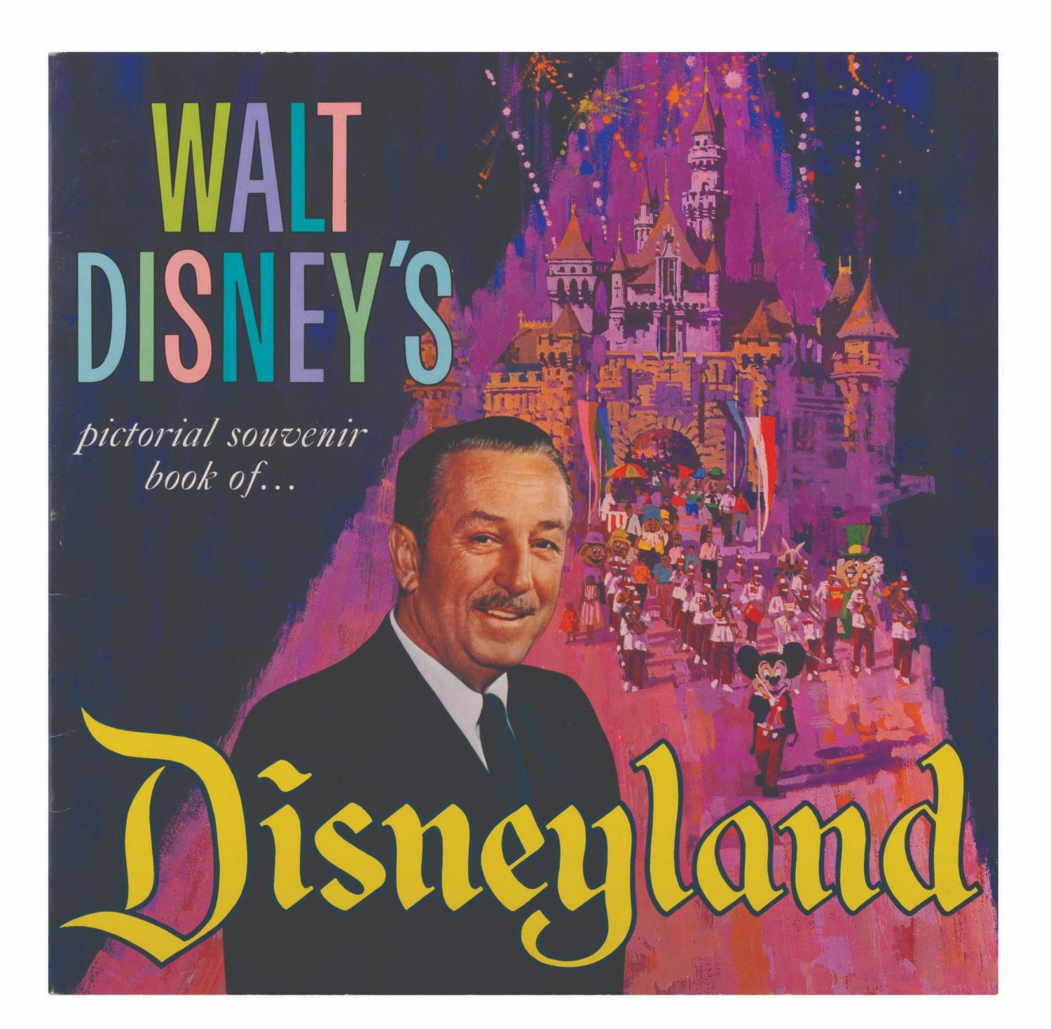 (Disneyland, 1965) An early guidebook from Disneyland titled, "Walt Disney's Pictorial Souvenir Book of Disneyland." This softcover booklet features sections with colorful images of early attractions like the Flying Saucers, Douglas Rocket to the Moon, Hans and Otto on the Matterhorn, and more, with "A Word from Walt." This edition includes pages dedicated to Disneyland After Dark, and a special fold-out dedicated to prior construction and "Projects on the Board" - The Haunted Mansion, New Orleans Square, It's a Small World, and "Tomorrow's Tomorrowland." Measuring 10.5"x10.5", this 32-page book is in very good condition, exhibiting fading, creases, scuffs, and wear.