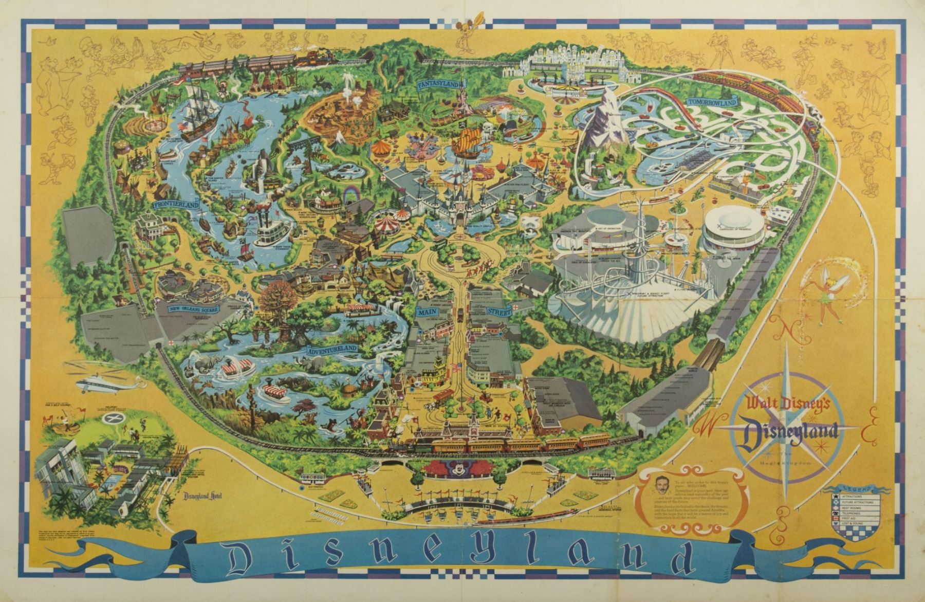 (Disneyland, 1966) This souvenir Disneyland map from 1966 features a blue, white, and purple border, and promotes the "New Tomorrowland" as well as the yet to be built "Space Mountain" attraction. The map measures 30"x45" and is in fair to good condition, with scattered spots of discoloration and wear.