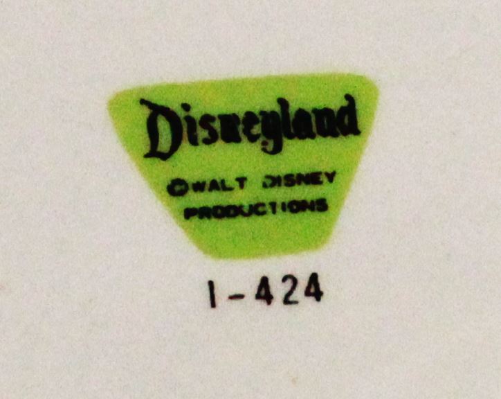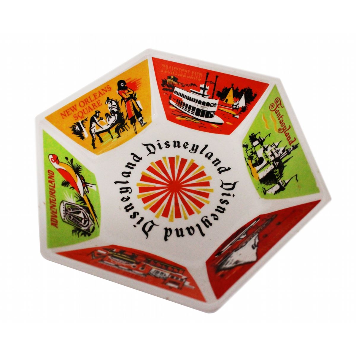 A charming colored candy dish from 1967 Disneyland, featuring artwork from the different lands. Great stylized piece measuring 5.25" in diameter, and 1.25" high. A very rare, and colorful item. In good condition with mild wear and discoloration.