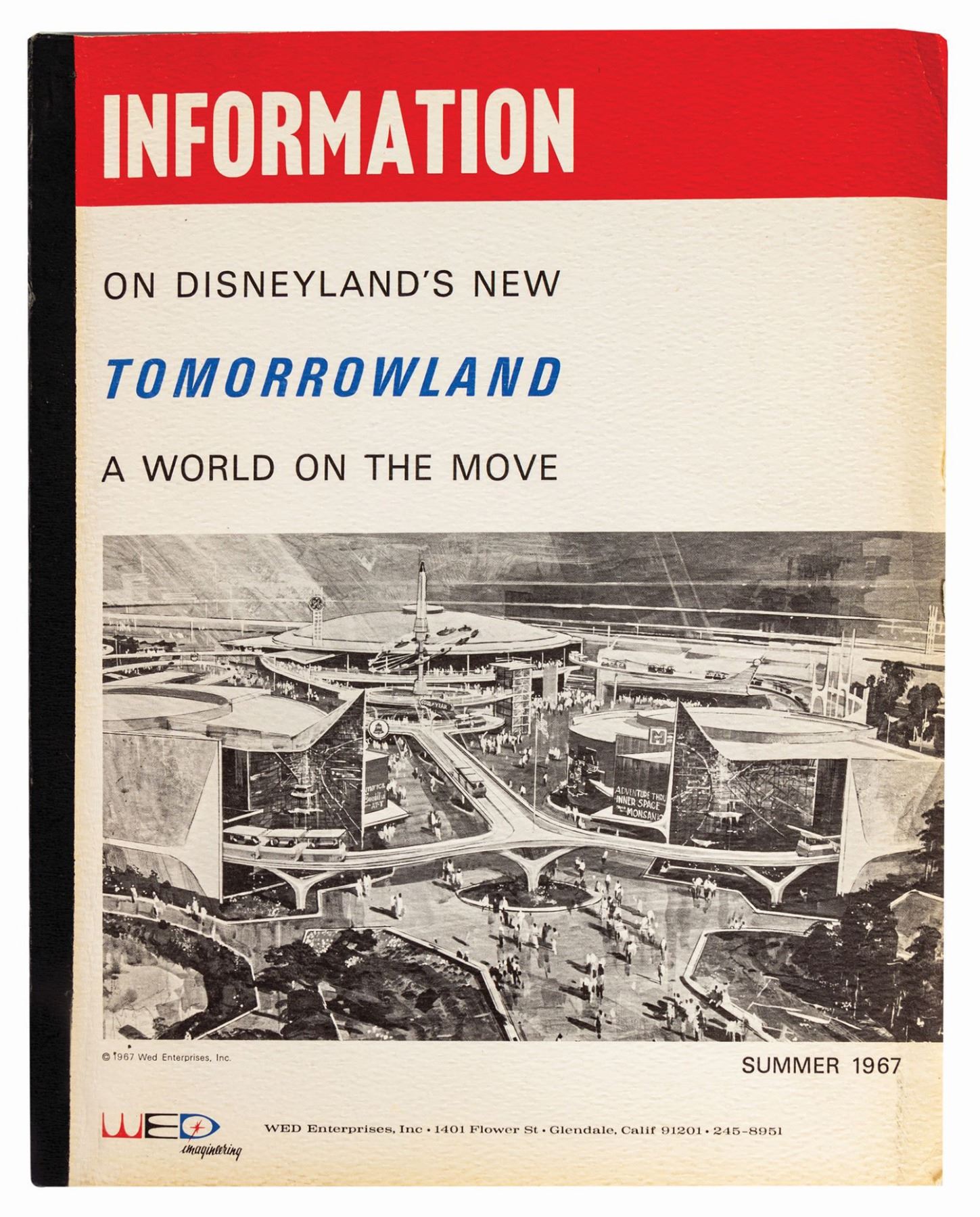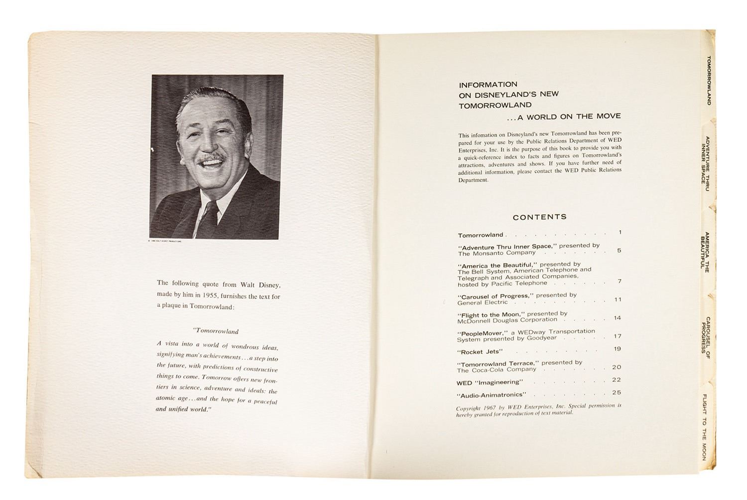 (Disneyland, 1967) A very rare press booklet created by WED Enterprises to highlight the new attractions debuting in the Summer 1967 New Tomorrowland expansion. Created shortly after the death of Walt Disney, this 24-page booklet begins with a quote by Walt from the opening of Tomorrowland in 1955, and contains five sections which describe Adventure thru Inner Space, America the Beautiful, Carousel of Progress, and Flight to the Moon. Measuring 11"x9", the booklet is in good condition with some wear along the edges of the cover from use.