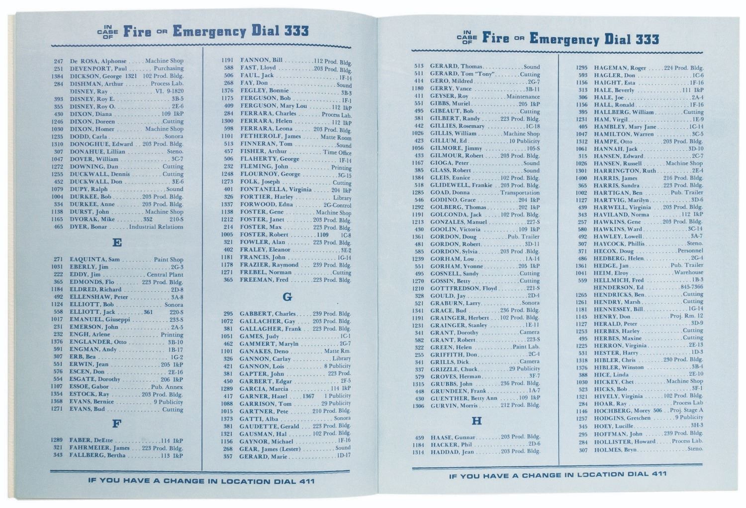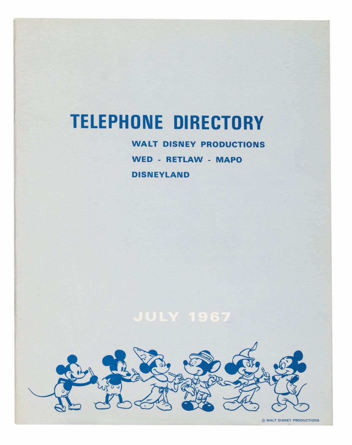 (Disney, 1967) A telephone directory for Walt Disney Productions, Disneyland, and WED/RETLAW/MAPO from July 1967. The 27-page directory features telephone contact information for various departments and individuals within the companies under the Disney umbrella, along with dialing instructions. Measuring 11"x8.5", the directory is in very good condition with minor edge-wear, and some darkening around the edges.