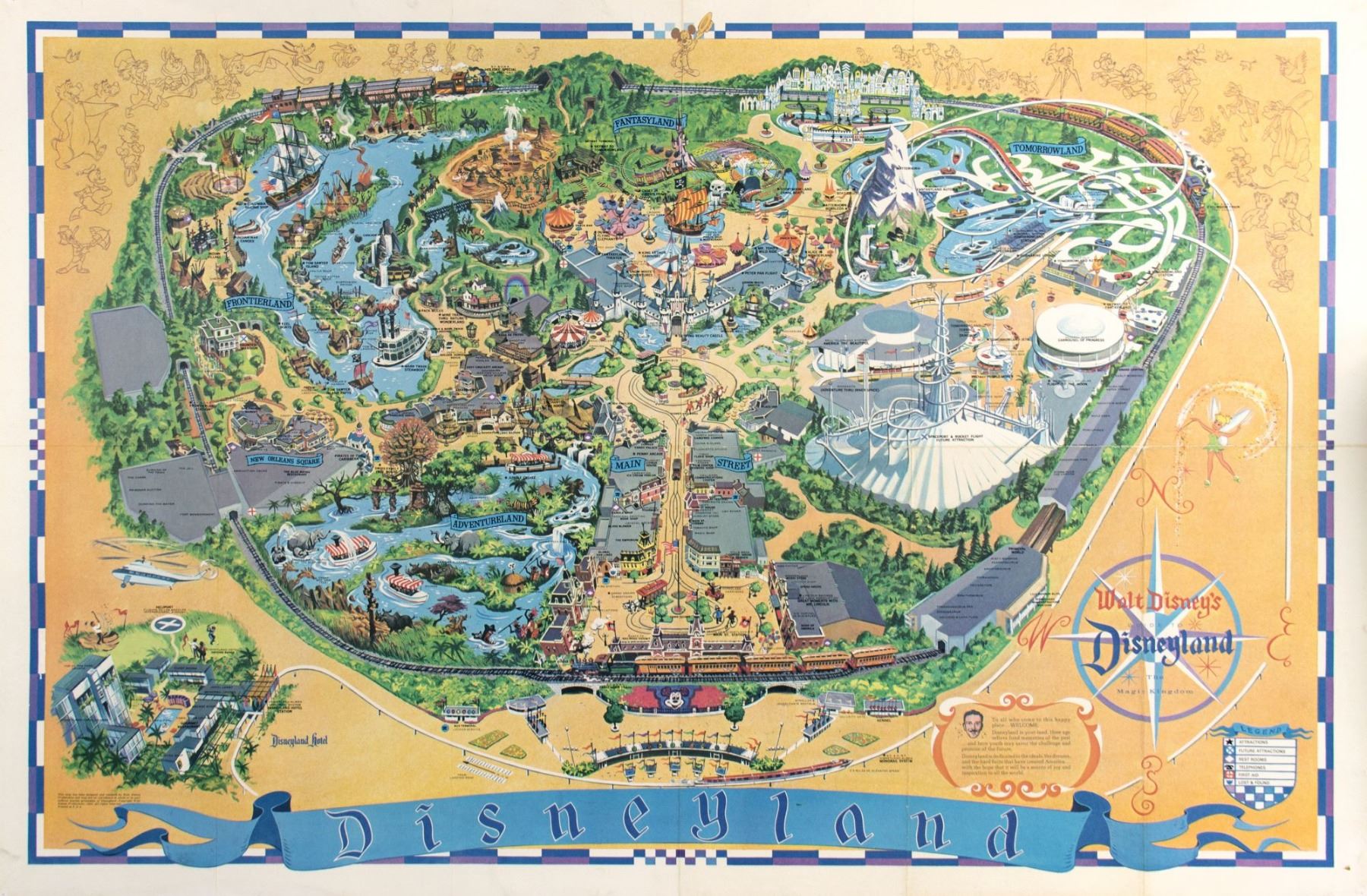 (Disneyland, 1968) This souvenir Disneyland map from 1968 features the new "Adventures Thru Inner Space" attraction while the "House of the Future" attraction has been removed. The map measures approximately 29.75"x45" and is in good condition with minor edge-wear and discoloration to the map. The map is mounted to a board backing for its preservation.