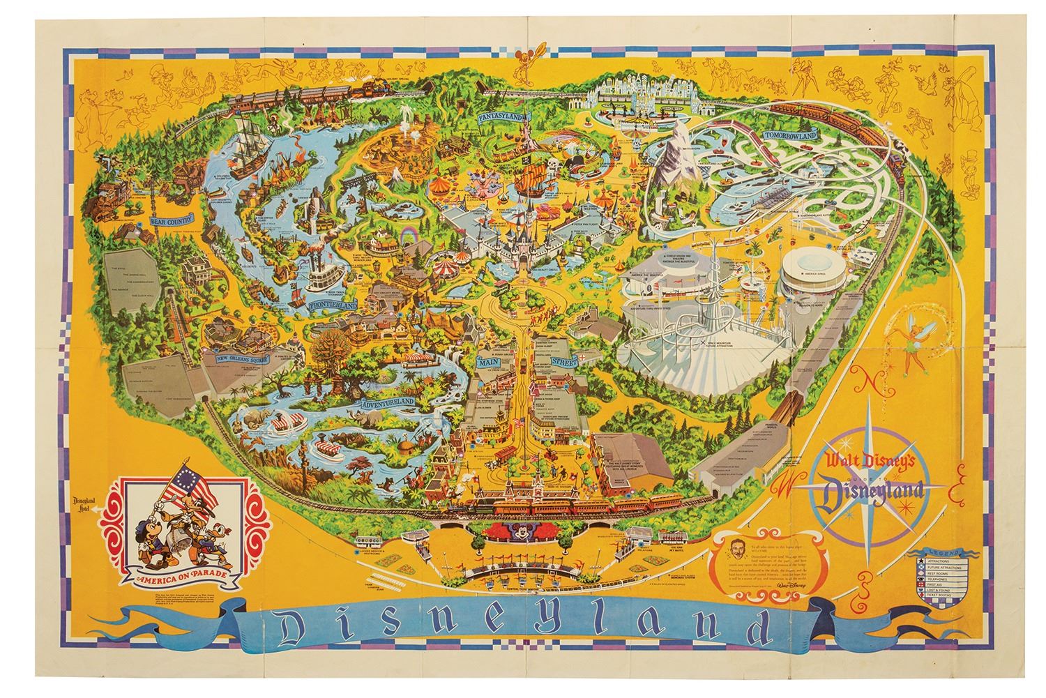(Disneyland, 1975) A large souvenir map of Disneyland from 1975 featuring an advertisement for America on Parade in the lower-left corner. Measuring 30"x44.5", the condition is fair with wear along the fold-lines including some large tears along the center line that have been reinforced with tape on the reverse.