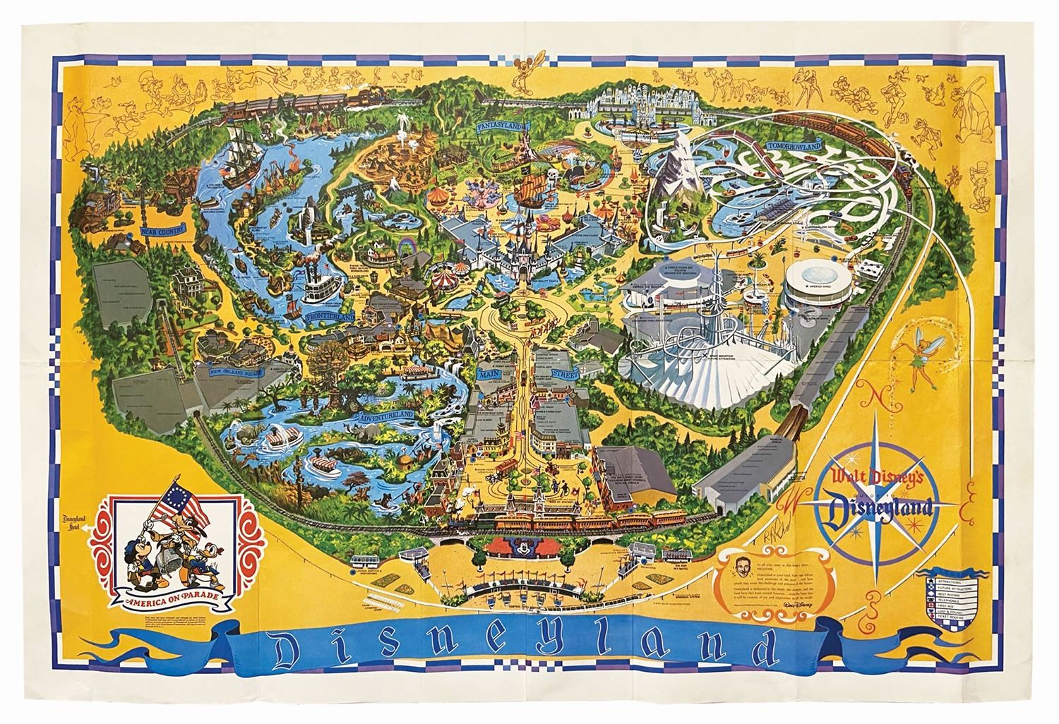 (Disneyland, 1975) A large souvenir map of Disneyland from 1975 featuring an advertisement for America on Parade in the lower-left corner. Measuring 30"x44.5", the condition is good with wear along the fold lines, particularly at the intersections of the folds. There is a minor tear on the right edge of the center fold.