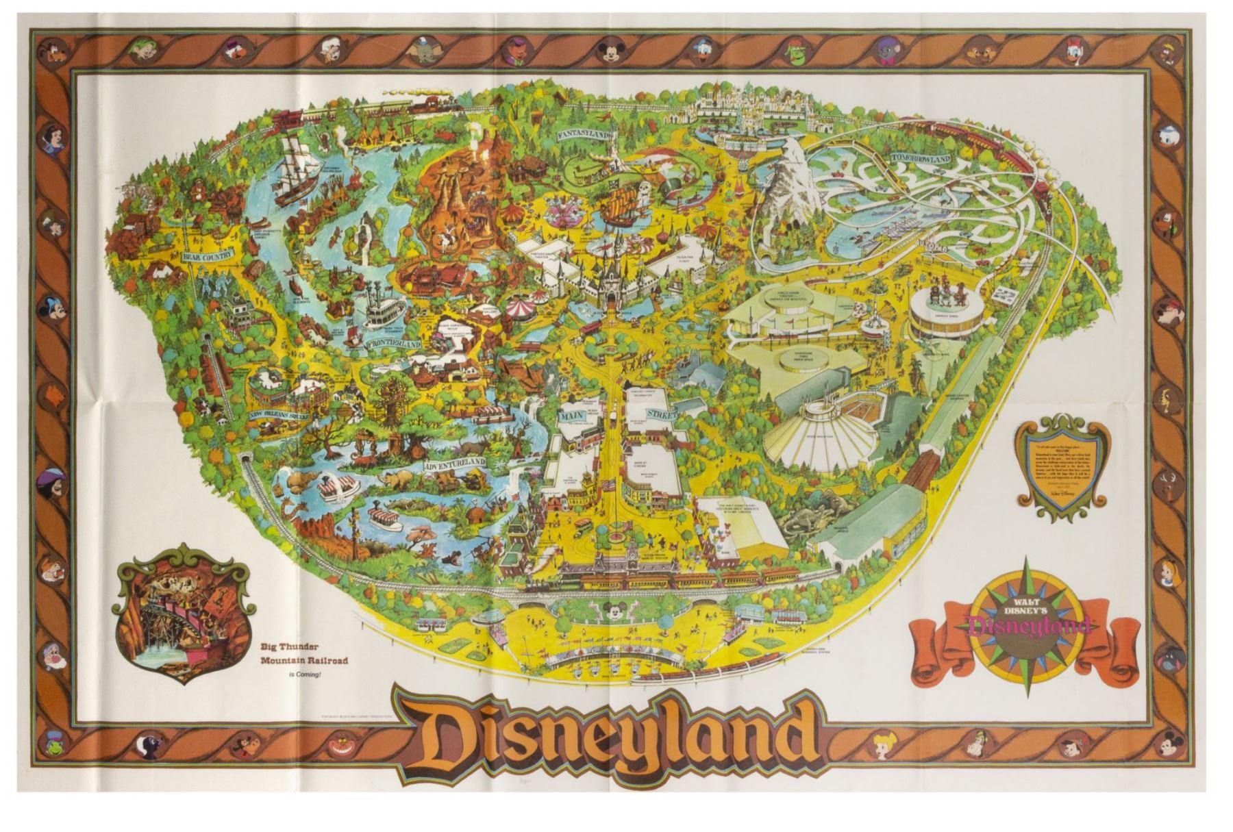 (Disneyland, 1978) A large souvenir map of Disneyland from 1978. This map features an advertisement announcing that "Big Thunder Mountain Railroad is coming!" in the lower-left corner and measures 30"x44.5". The condition is very good overall with some wear to the original fold-lines and minor edge-wear from light use.