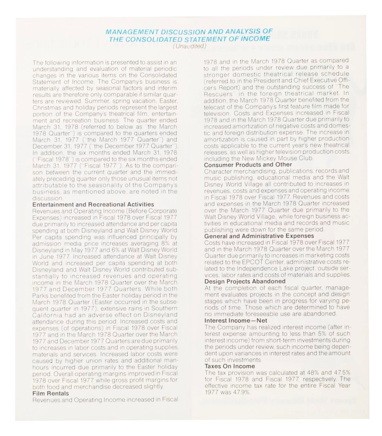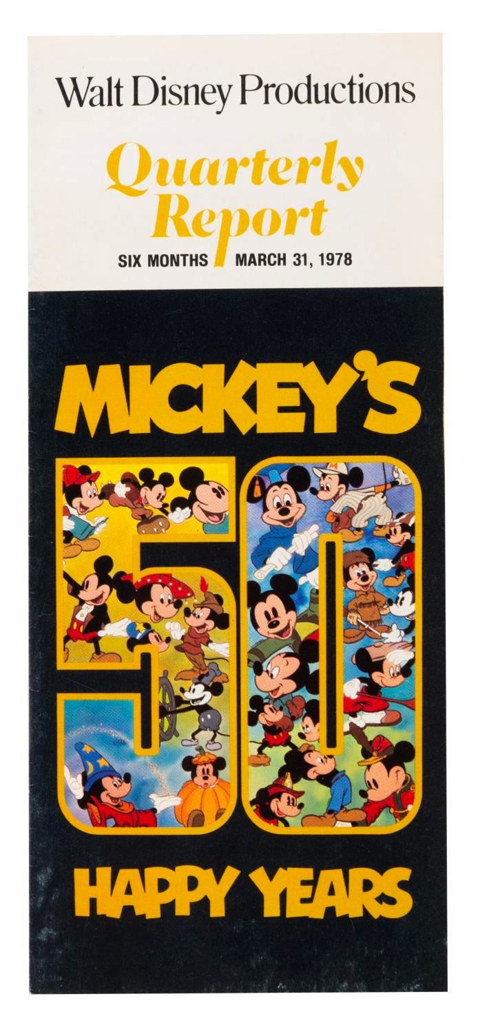(Disney, 1978) A Walt Disney Productions quarterly report for the period ending March 31, 1978, with a Mickey’s 50 Happy Years cover. Measuring 3.25" x 7.5", the report is in very good condition with light wear and discoloration from age.