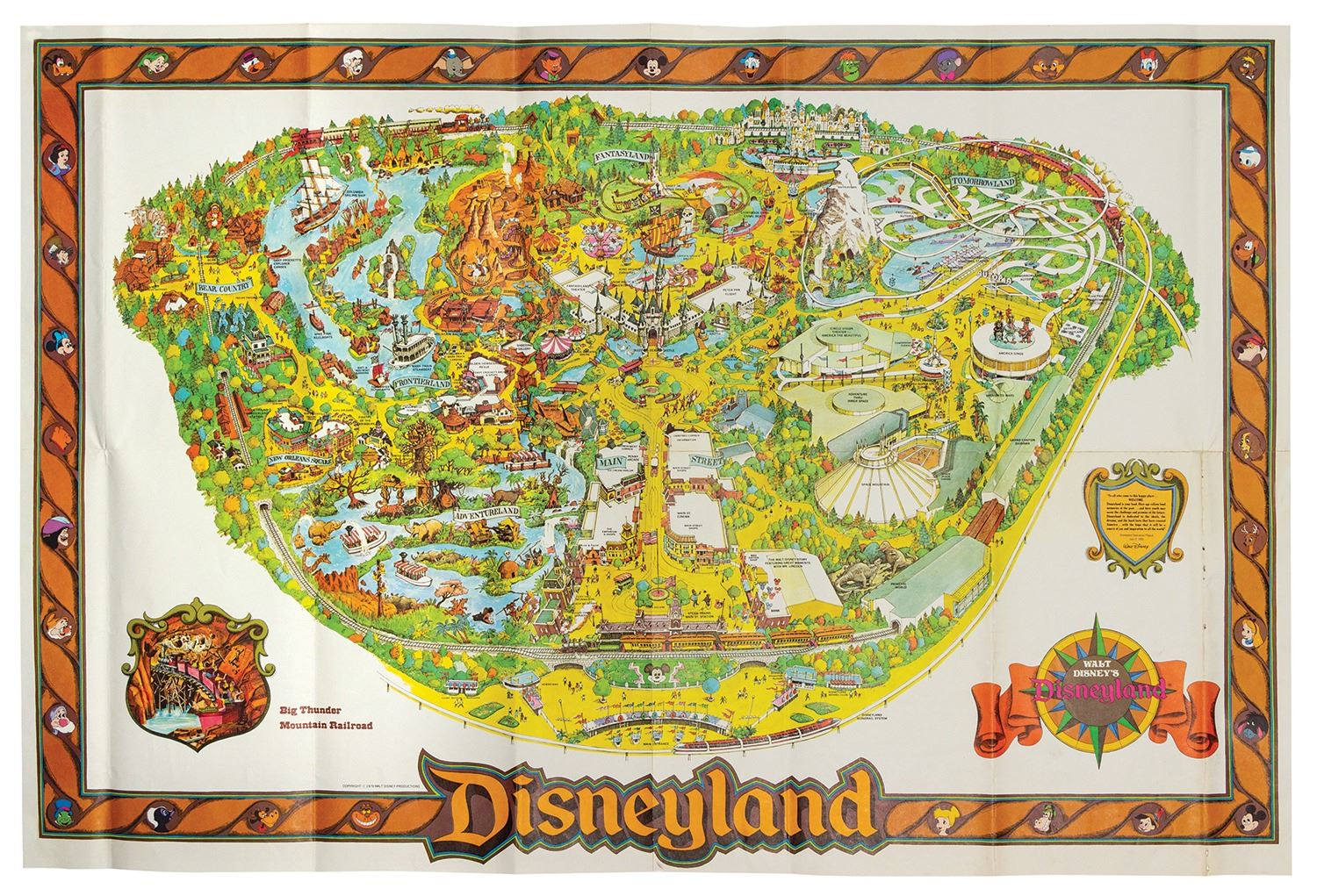 (Disneyland, 1979) A large souvenir map of Disneyland from 1979. The map features an advertisement for the newly opened Big Thunder Mountain Railroad in the lower-left corner and measures 29.5"x43.75". The condition is fair with wear and minor tears along the fold-lines and some holes along the right-most fold.