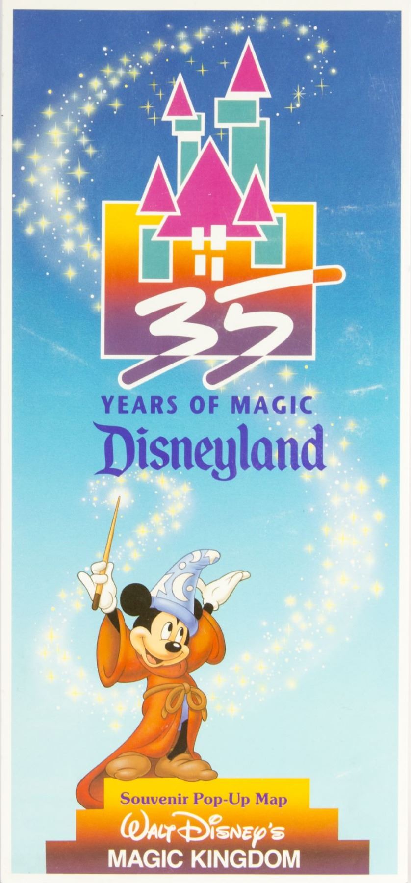 (Disneyland, 1990) A souvenir Disneyland pop-up map celebrating the park's 35th Anniversary in 1990. The map measures 18"x26" while opened and is in good condition with minimal wear.