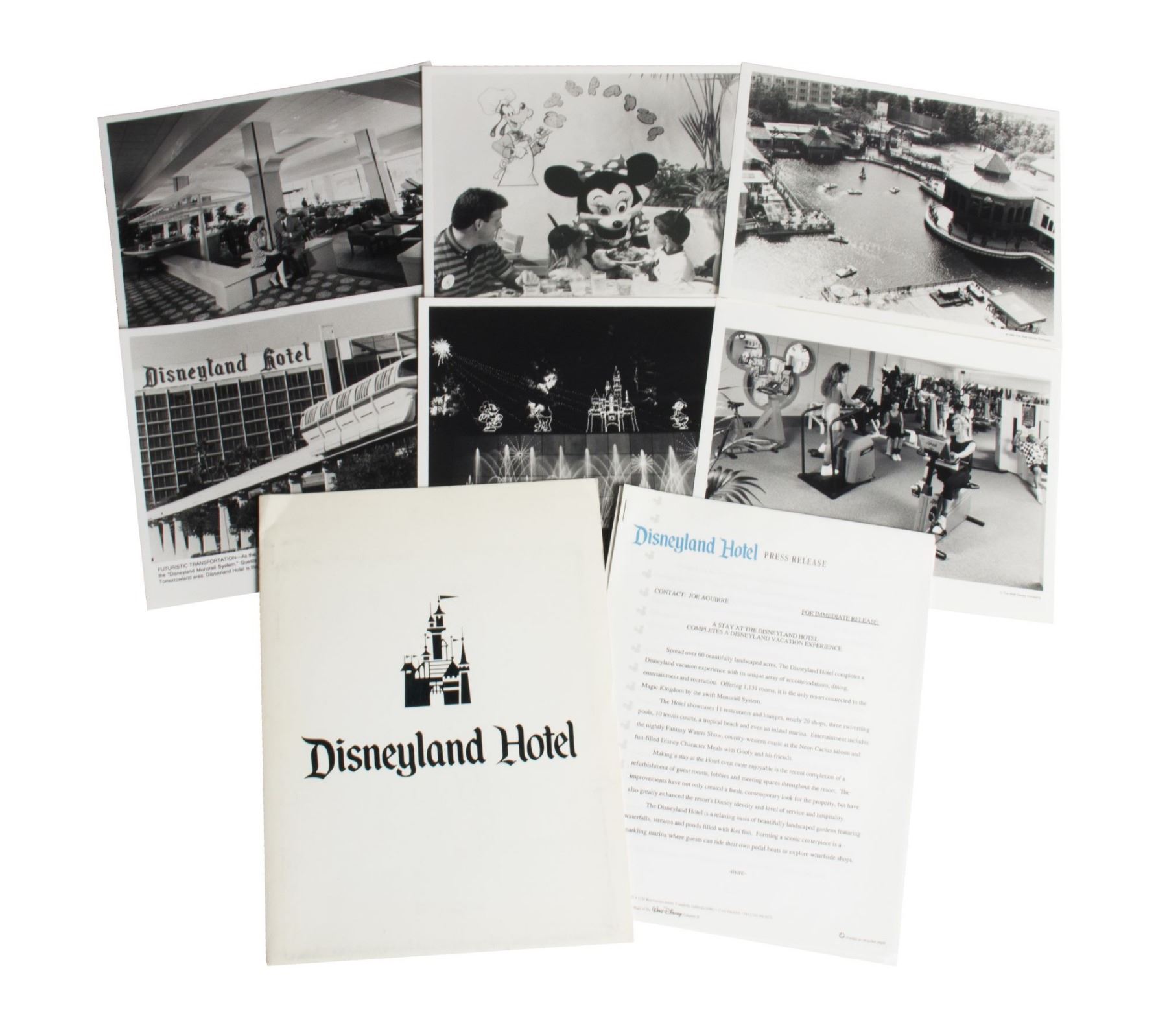 (Disneyland, 1991) A rare press packet created to promote the newly remodeled Disneyland Hotel in 1991. Due to financial issues during the construction of Disneyland, the Disneyland Hotel was originally owned and operated by the Wrather Corporation, and despite attempts by Disney to acquire the hotel, they were unsuccessful until 1988. This packet was sent to press agencies to inform them of the Disneyland Hotel's renewal and enhancements, and includes (6) high-quality black and white photos of the hotel and (4) press release documents. The outer folder measures 12"x9" and the packet is in very good condition with some surface wear to the folder.